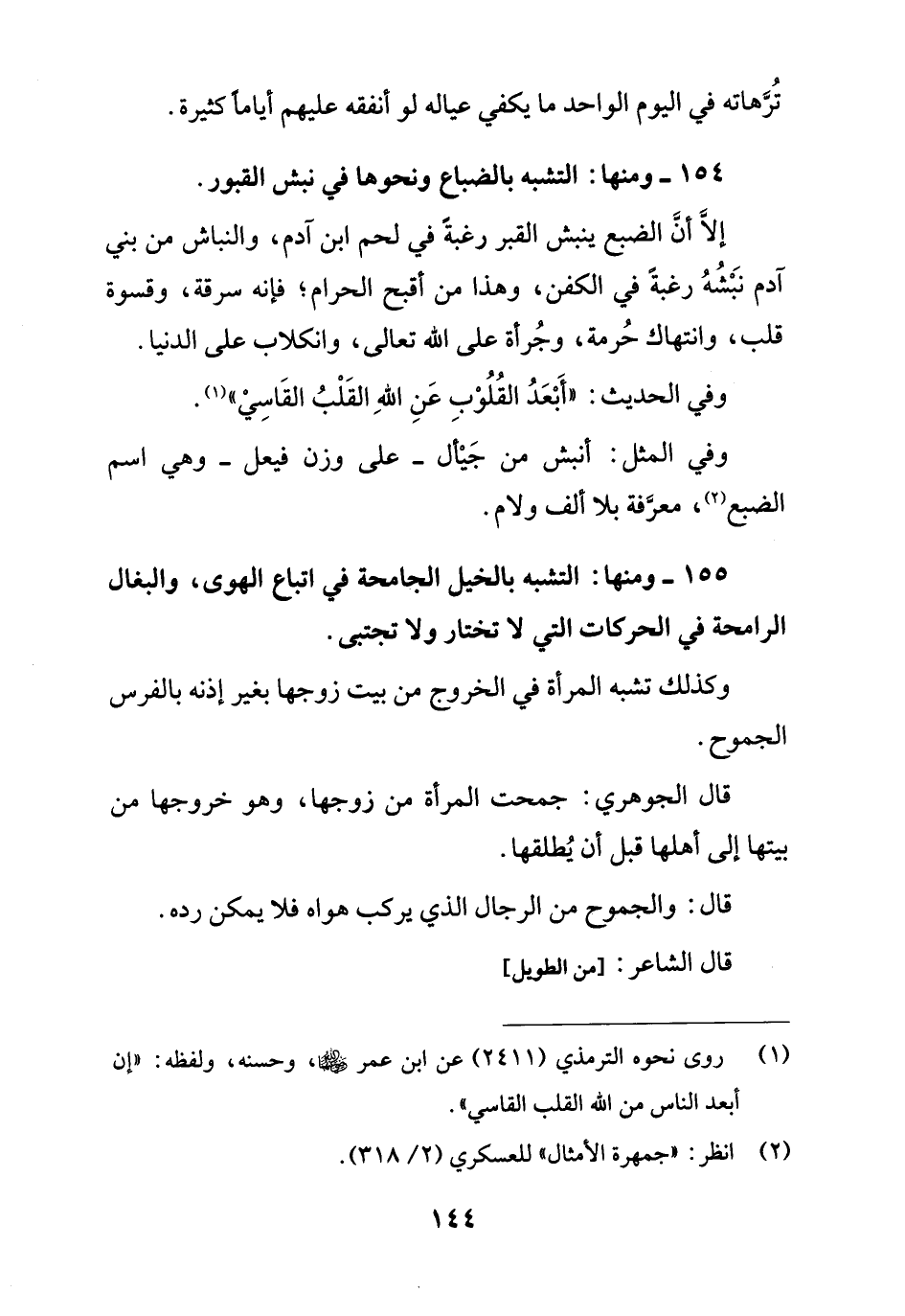 155 - ومنها: التشبه بالخيل الجامحة في اتباع الهوى، والبغال الرامحة في الحركات التي لا تختار ولا تجتبى.