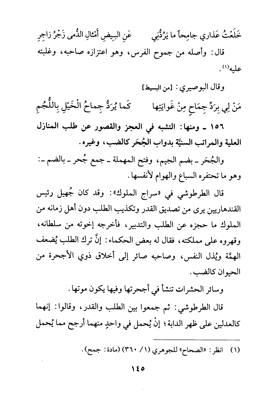 156 - ومنها: التشبه في العجز والقصور عن طلب المنازل العلية والمراتب السنيَّة بدواب الجُحَر كالضب، وغيره.