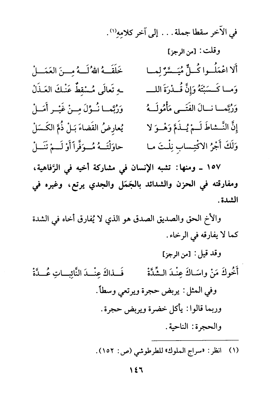 157 - ومنها: تشبه الإنسان في مشاركة أخيه في الرَّفاهية، ومفارقته في الحزن والشدائد بالجَمَل والجدي يرتع، وغيره في الشدة.