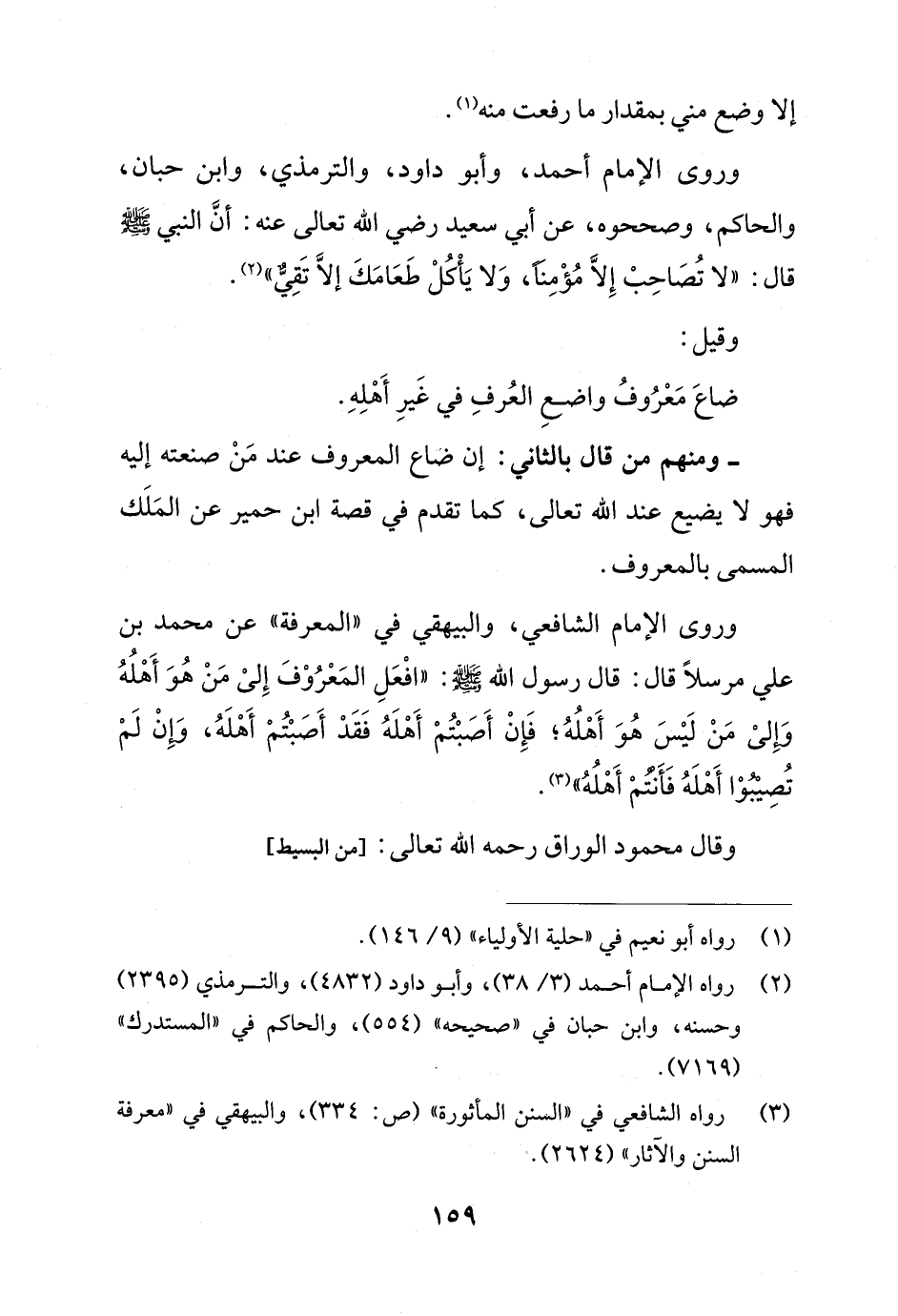 وروى الإمام أحمد، وأبو داود، والترمذي، وابن حبان، والحاكم، وصححوه، عن أبي سعيد رضي الله تعالى عنه: أن النبي - صلى الله عليه وسلم - قال: "لا تُصَاحِبْ إِلاَّ مُؤْمِنًا، وَلا يَأْكُلْ طَعَامَكَ إلاَّ تَقِيٌّ" (¬2).