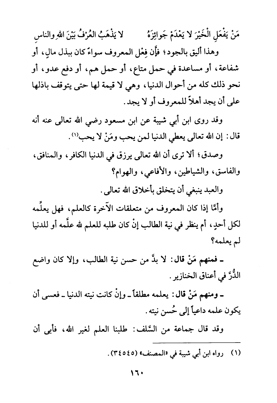 وأمَّا إذا كان المعروف من متعلقات الآخرة كالعلم، فهل يعلِّمه لكل أحدٍ، أم ينظر في نية الطالب إنْ كان طلبه للعلم لله علَّمه أو للدنيا لم يعلمه؟