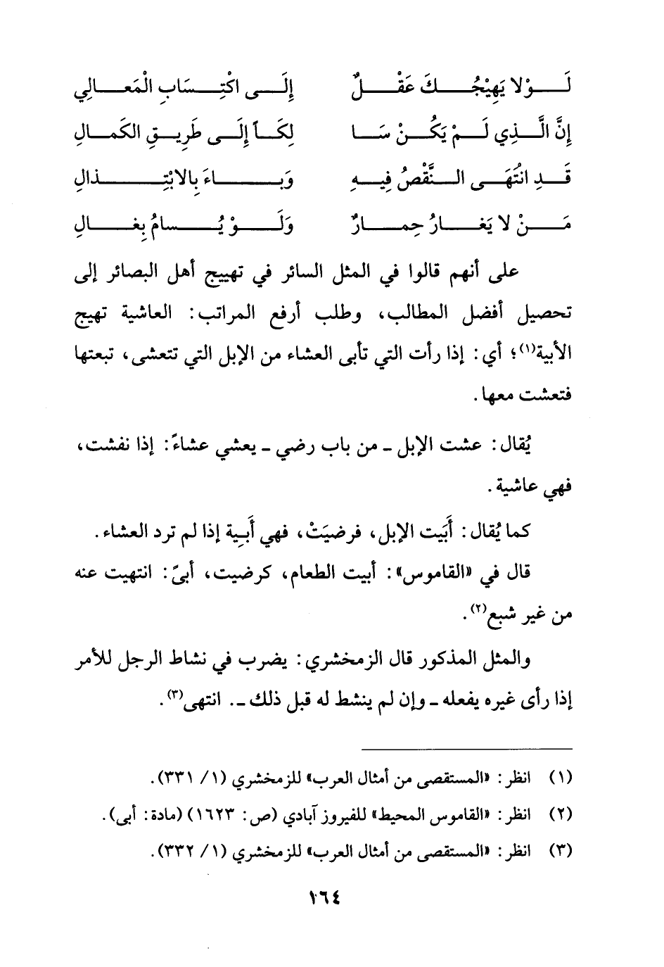 على أنهم قالوا في المثل السائر في تهييج أهل البصائر إلى تحصيل أفضل المطالب، وطلب أرفع المراتب: العاشية تهيج الأبية (¬1)؛ أي: إذا رأت التي تأبى العشاء من الإبل التي تتعشى، تبعتها فتعشت معها.