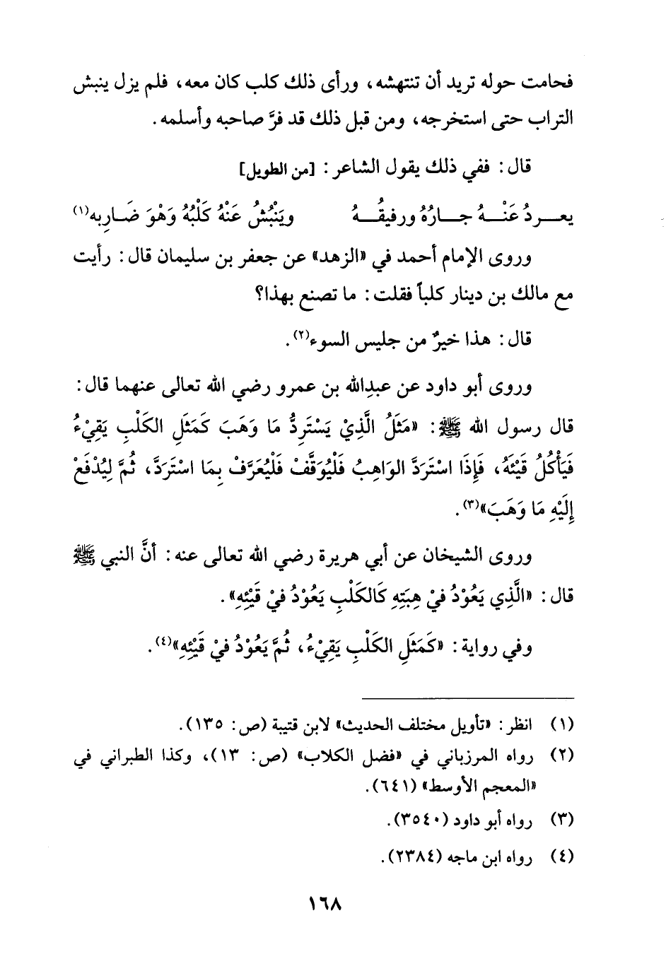 وروى أبو داود عن عبدِ الله بن عمرو رضي الله تعالى عنهما قال: قال رسول الله - صلى الله عليه وسلم -: "مَثَلُ الَّذِيْ يَسْتَرِدُّ مَا وَهَبَ كَمَثَلِ الكَلْبِ يَقِيْءُ فَيَأْكُلُ قَيْئَهُ، فَإِذَا اسْتَرَدَّ الوَاهِبُ فَلْيُوَقَّفْ فَلْيُعَرَّفْ بِمَا اسْتَرَدَّ، ثُمَّ لِيُدْفَعْ إِلَيْهِ مَا وَهَبَ" (¬3).