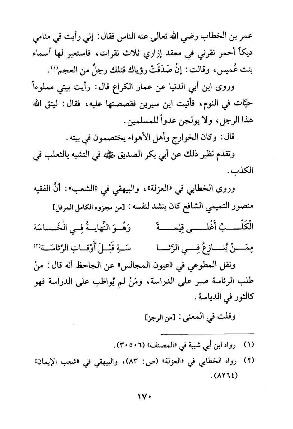 وروى الخطابي في "العزلة"، والبيهقي في "الشعب": أنَّ الفقيه منصور التميمي الشافع كان ينشد لنفسه: [من مجزوء الكامل المرفل]