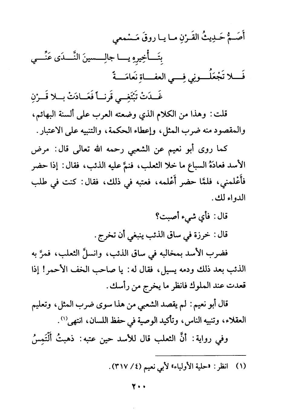 كما روى أبو نعيم عن الشعبي رحمه الله تعالى قال: مرض الأسد فعادَهُ السباع ما خلا الثعلب، فنمَّ عليه الذئب، فقال: إذا حضر فأَعْلمني، فلمَّا حضر أَعْلمه، فعتبه في ذلك، فقال: كنت في طلب الدواء لك.