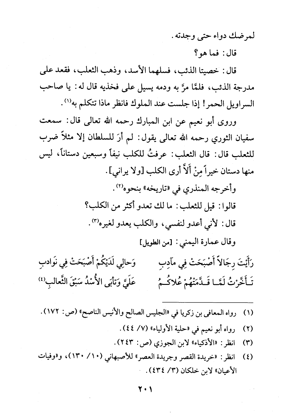 وروى أبو نعيم عن ابن المبارك رحمه الله تعالى قال: سمعت سفيان الثوري رحمه الله تعالى يقول: لم أرَ للسلطان إلا مثلاً ضرب للثعلب قال: قال الثعلب: عرفتُ للكلب نيفًا وسبعين دستاناً، ليس منها دستان خيرًا مِنْ أَلاَّ أرى الكلب [ولا يراني].