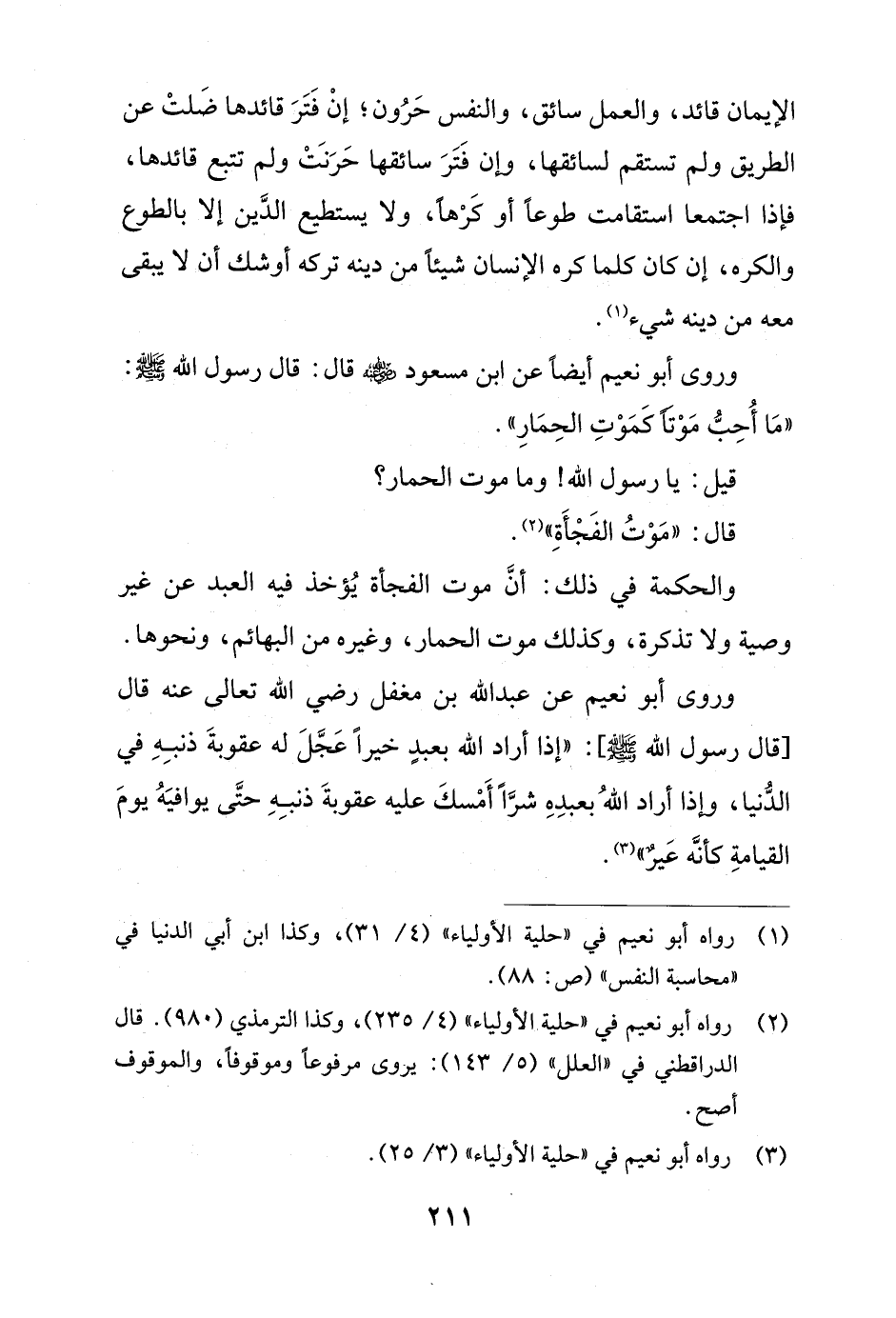 وروى أبو نعيم أيضًا عن ابن مسعود - رضي الله عنه - قال: قال رسول الله - صلى الله عليه وسلم -: "مَا أُحِبُّ مَوْتًا كَمَوْتِ الحِمَارِ".