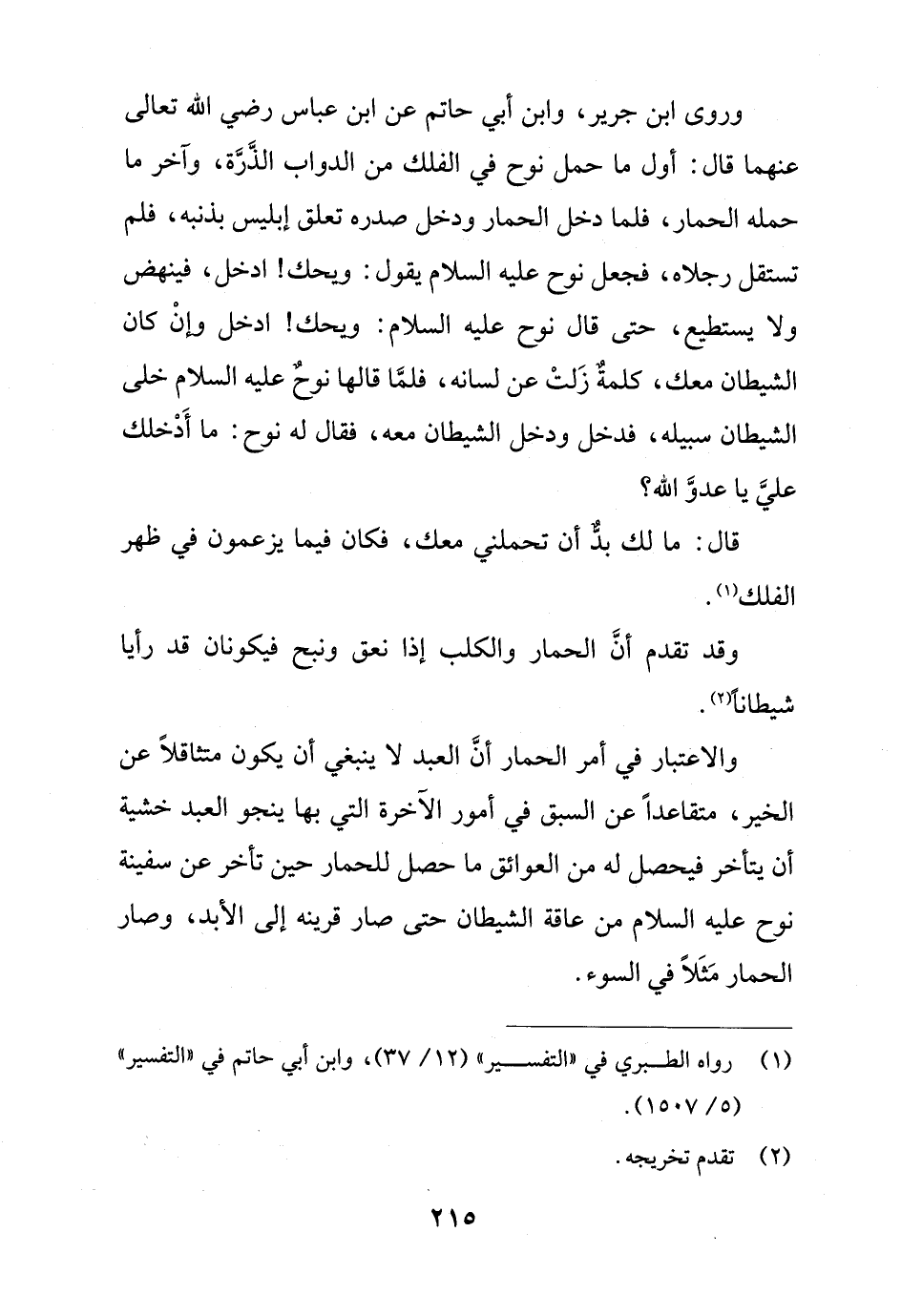 وروى ابن جرير، وابن أبي حاتم عن ابن عباس رضي الله تعالى عنهما قال: أول ما حمل نوح في الفلك من الدواب الذَّرَّة، وآخر ما حمله الحمار، فلما دخل الحمار ودخل صدره تعلق إبليس بذنبه، فلم تستقل رجلاه، فجعل نوح عليه السلام يقول: ويحك! ادخل، فينهض ولا يستطيع، حتى قال نوح عليه السلام: ويحك! ادخل وإنْ كان الشيطان معك، كلمةٌ زَلتْ عن لسانه، فلمَّا قالها نوح عليه السلام خلى الشيطان سبيله، فدخل ودخل الشيطان معه، فقال له نوح: ما أَدْخلك عليَّ يا عدوَّ الله؟