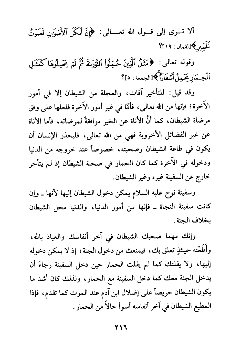 وقد قيل: للتأخير آفات، والعجلة من الشيطان إلا في أمور الآخرة؛ فإنها من الله تعالى، فأمَّا في غير أمور الآخرة فلعلها على وفق مرضاة الشيطان، كما أن الأناة عن الخير موافقةً لمرضاته، فأما الأناة عن غير الفضائل الأخروية فهي من الله تعالى، فليحذر الإنسان أن يكون في طاعة الشيطان وصحبته، خصوصاً عند خروجه من الدنيا ودخوله في الآخرة كما كان الحمار في صحبة الشيطان إذ لم يتأخر خارج عن السفينة غيره وغير الشيطان.
