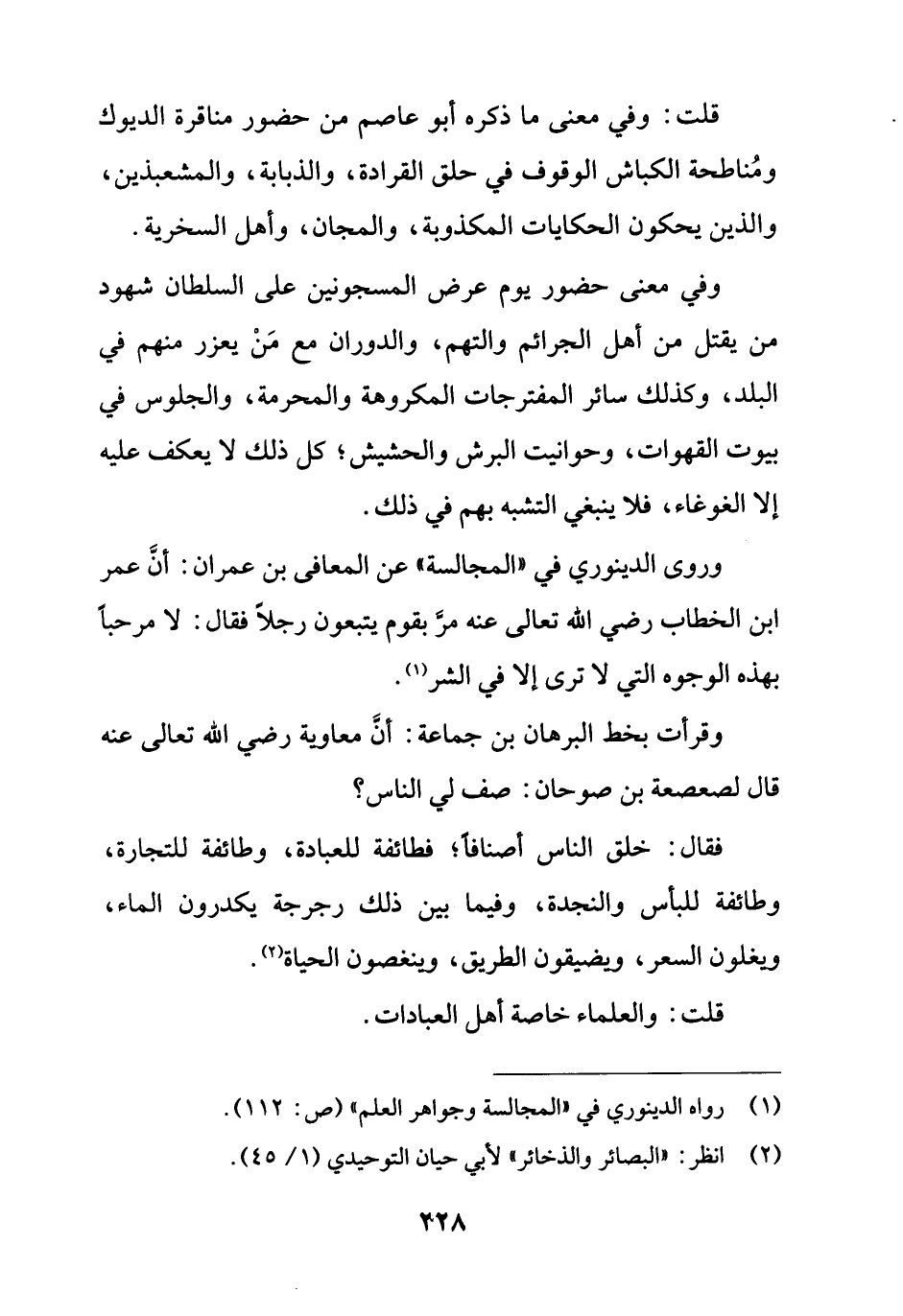 قلت: وفي معنى ما ذكره أبو عاصم من حضور مناقرة الديوك ومُناطحة الكباش الوقوف في حلق القرادة، والذبابة، والمشعبذين، والذين يحكون الحكايات المكذوبة، والمجان، وأهل السخرية.