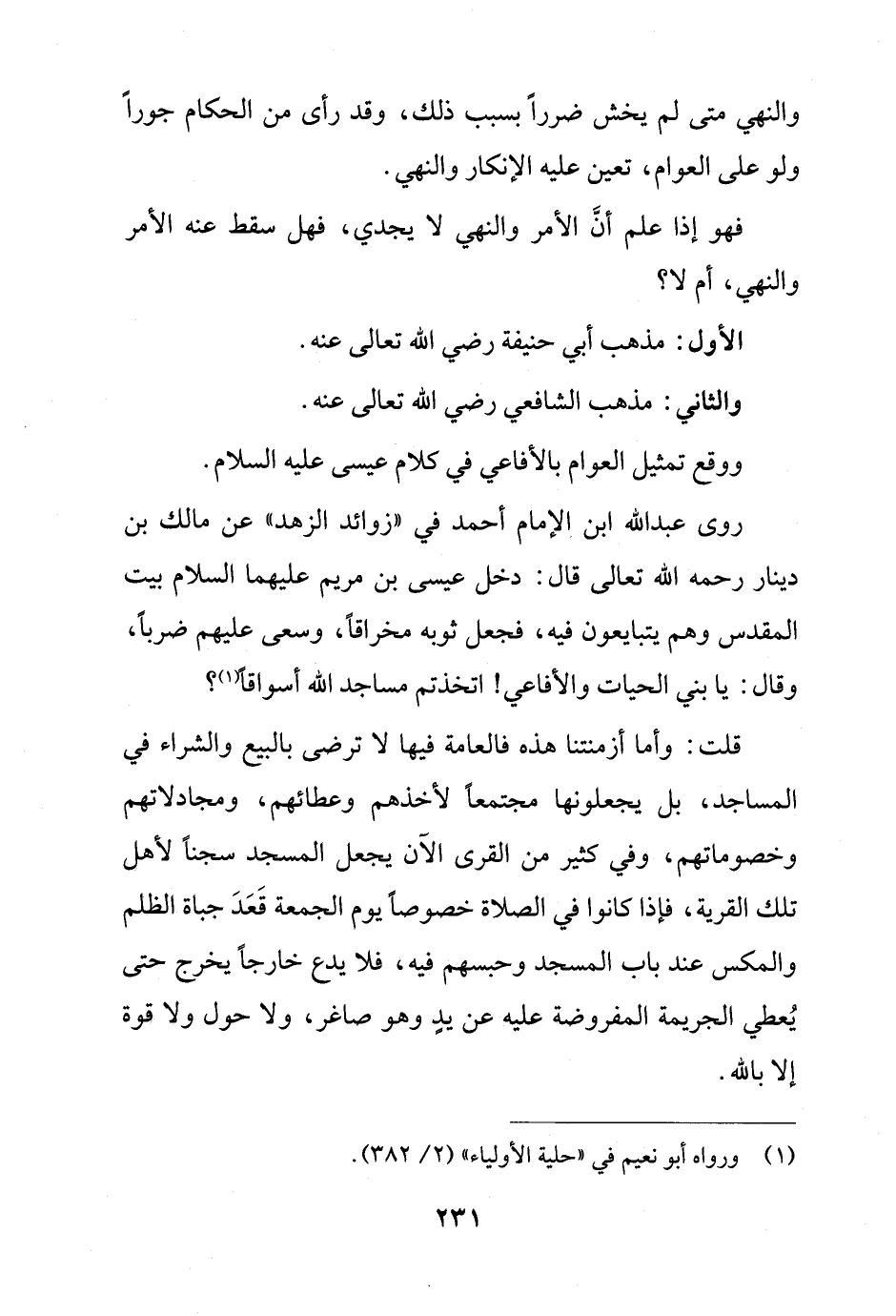 روى عبد الله ابن الإمام أحمد في "زوائد الزهد" عن مالك بن دينار رحمه الله تعالى قال: دخل عيسى بن مريم عليهما السلام بيت المقدس وهم يتبايعون فيه، فجعل ثوبه مخراقاً، وسعى عليهم ضرباً، وقال: يا بني الحيات والأفاعي! اتخذتم مساجد الله أسواقاً (¬1)؟
