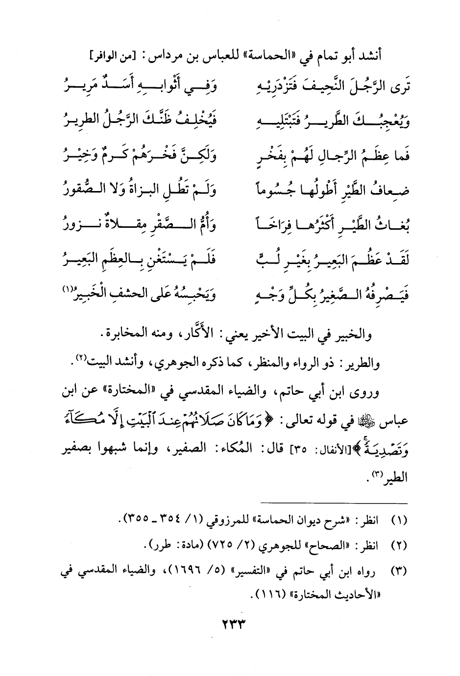 وروى ابن أبي حاتم، والضياء المقدسي في "المختارة" عن ابن عباس - رضي الله عنهما - في قوله تعالى: {وَمَا كَانَ صَلَاتُهُمْ عِنْدَ الْبَيْتِ إِلَّا مُكَاءً وَتَصْدِيَةً} [الأنفال: 35] قال: المُكاء: الصفير، وإنما شبهوا بصفير الطير (¬3).