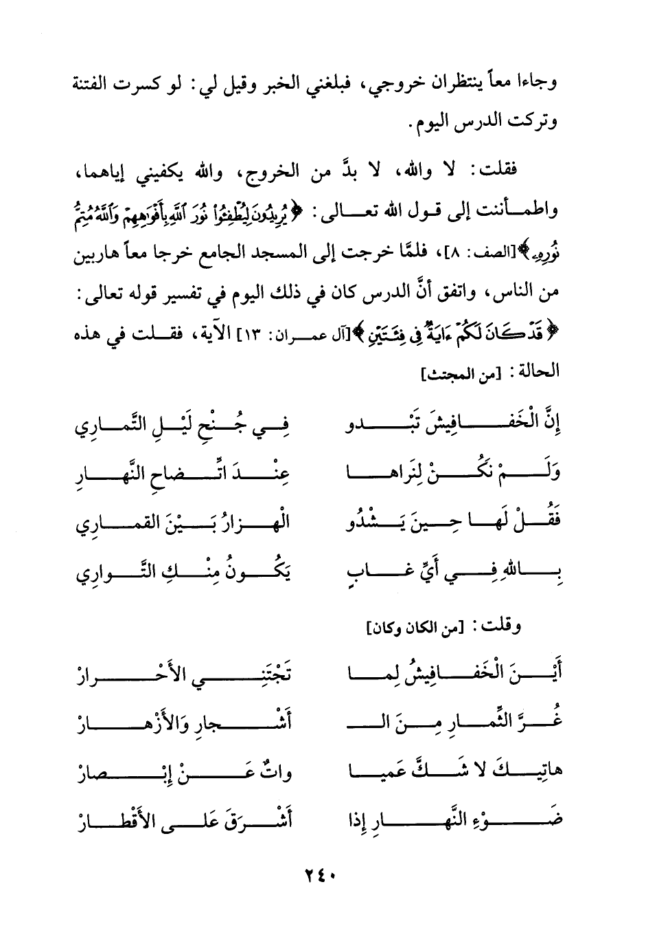 فقلت: لا والله، لا بدَّ من الخروج، والله يكفيني إياهما، واطمأننت إلى قول الله تعالى: {يُرِيدُونَ لِيُطْفِئُوا نُورَ اللَّهِ بِأَفْوَاهِهِمْ وَاللَّهُ مُتِمُّ نُورِهِ} [الصف: 8]، فلمَّا خرجت إلى المسجد الجامع خرجا معاً هاربين من الناس، واتفق أنَّ الدرس كان في ذلك اليوم في تفسير قوله تعالى: {قَدْ كَانَ لَكُمْ آيَةٌ فِي فِئَتَيْنِ} [آل عمران: 13] الآية، فقلت في هذه الحالة: [من المجتث]