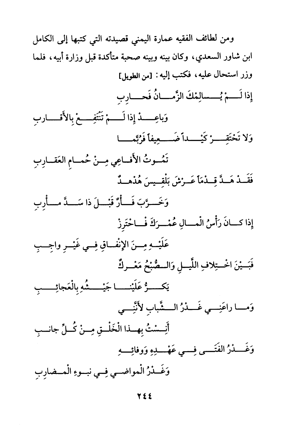 ومن لطائف الفقيه عمارة اليمني قصيدته التي كتبها إلى الكامل