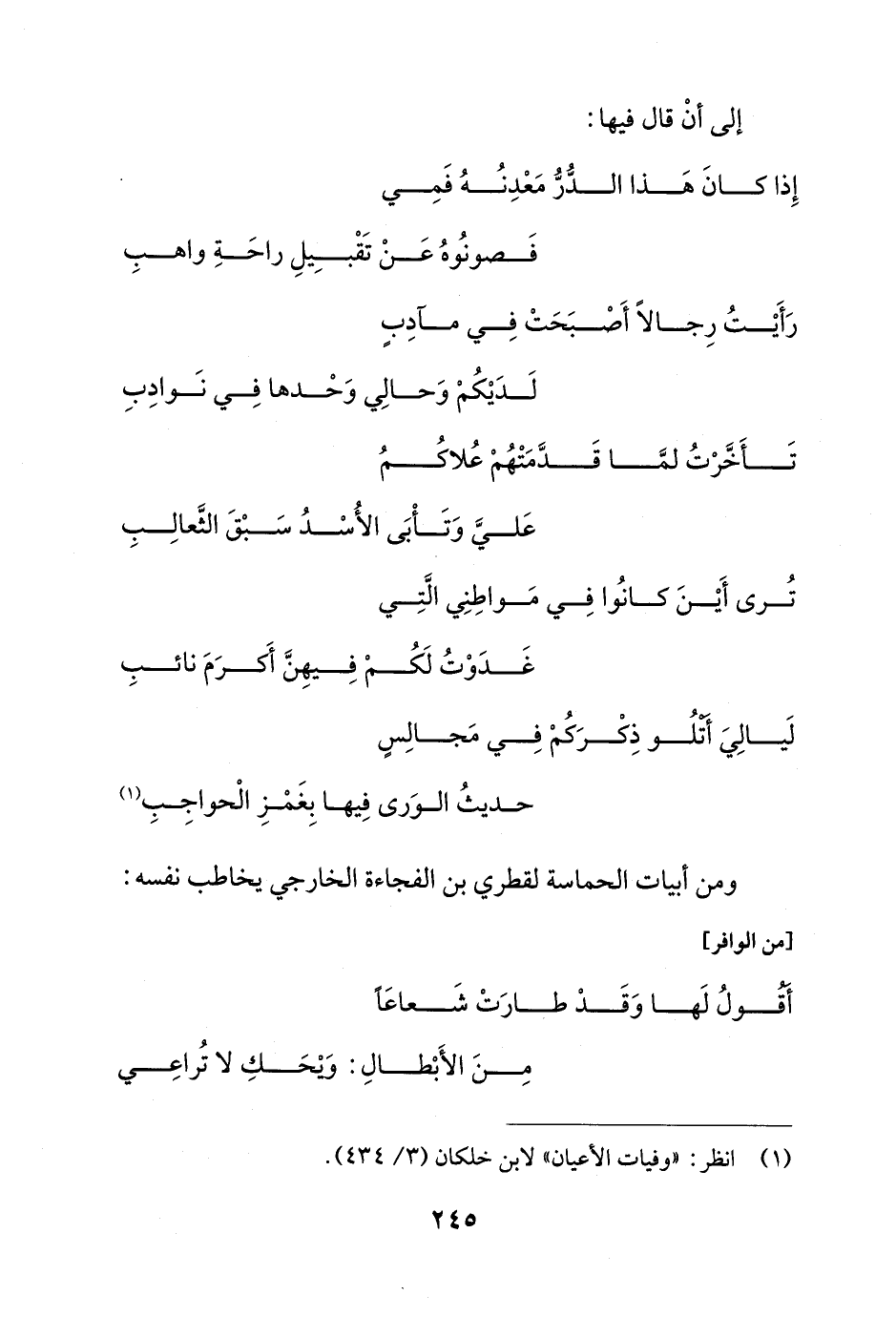 ومن أبيات الحماسة لقطري بن الفجاءة الخارجي يخاطب نفسه: [من الوافر]