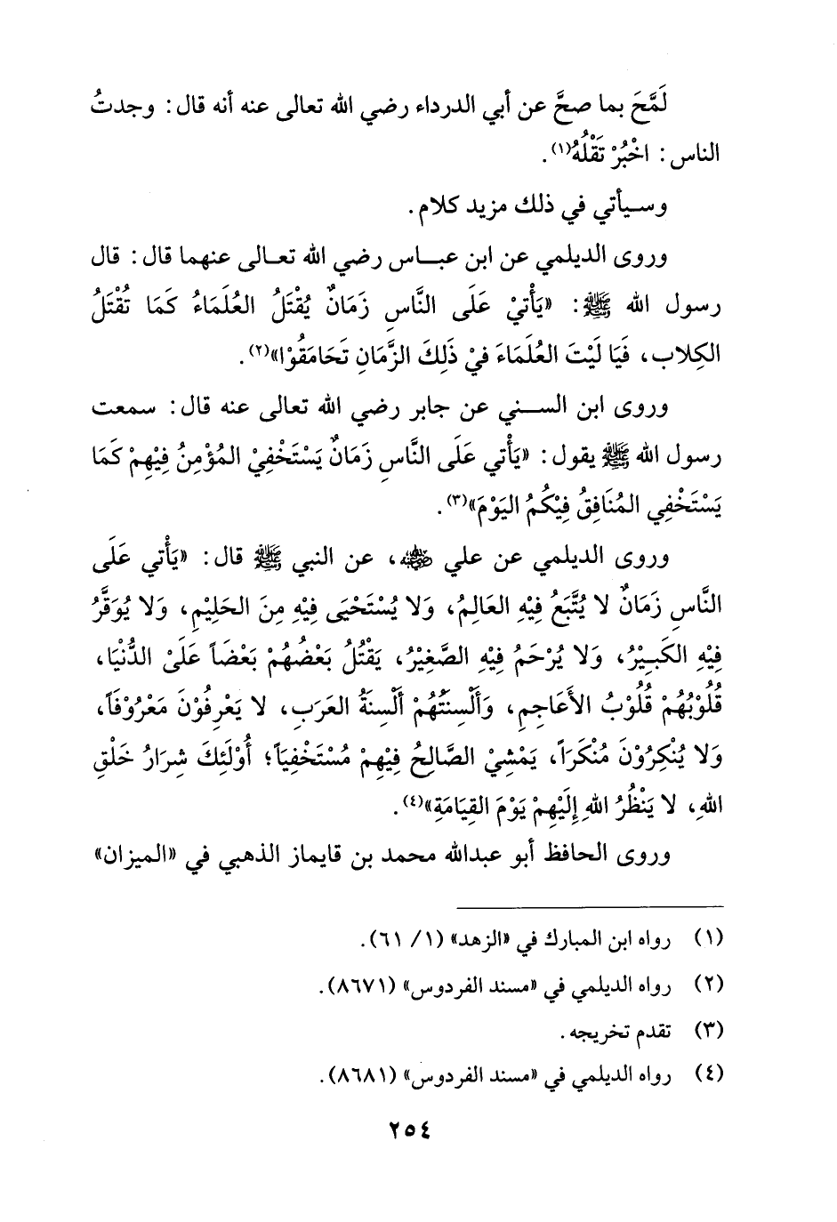 وروى الديلمي عن علي - رضي الله عنه -، عن النبي - صلى الله عليه وسلم - قال: "يَأْتي عَلَى النَّاسِ زَمَانٌ لا يُتَّبَعُ فِيْهِ العَالِمُ، وَلا يُسْتَحْيَى فِيْهِ مِنَ الحَلِيْمِ، وَلا يُوَقَّرُ فِيْهِ الكَبِيْرُ، وَلا يُرْحَمُ فِيْهِ الصَّغِيْرُ، يَقْتُلُ بَعْضُهُمْ بَعْضًا عَلَىْ الدُّنْيَا، قُلُوْبُهُمْ قُلُوْبُ الأَعَاجِمِ، وَأَلْسِنَتُهُمْ أَلْسِنَةُ العَرَبِ، لا يَعْرِفُوْنَ مَعْرُوْفًا، وَلا يُنْكِرُوْنَ مُنْكَرًا، يَمْشِيْ الصَّالِحُ فِيْهِمْ مُسْتَخْفِيًا؛ أُوْلَئِكَ شِرَارُ خَلْقِ اللهِ، لا يَنْظُرُ اللهِ إِلَيْهِمْ يَوْمَ القِيَامةِ" (¬4).