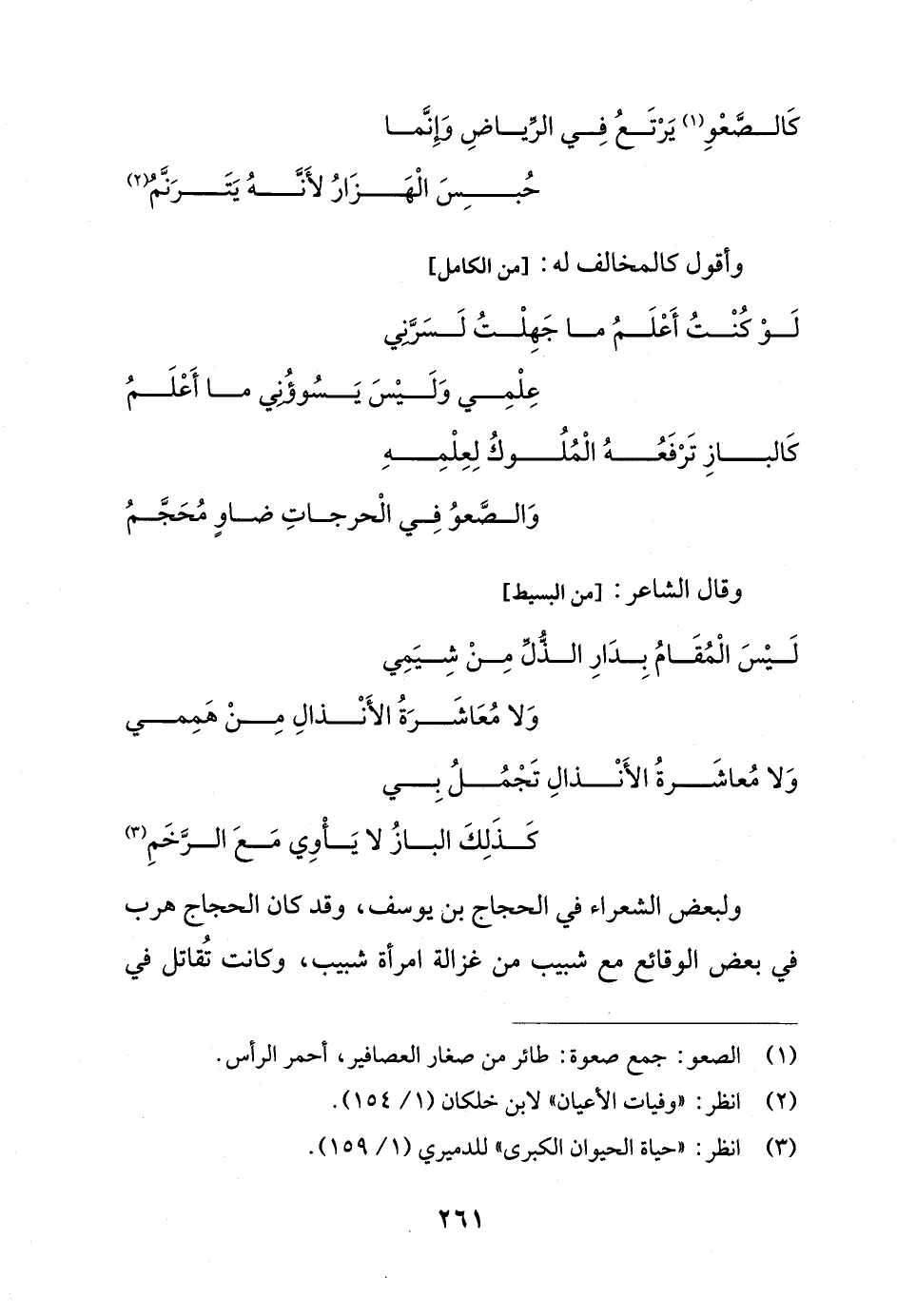 كَالبازِ تَرْفَعُهُ الْمُلُوكُ لِعِلْمِهِ ... وَالصَّعو فِي الْحرجاتِ ضاوٍ مُحَجَّمُ