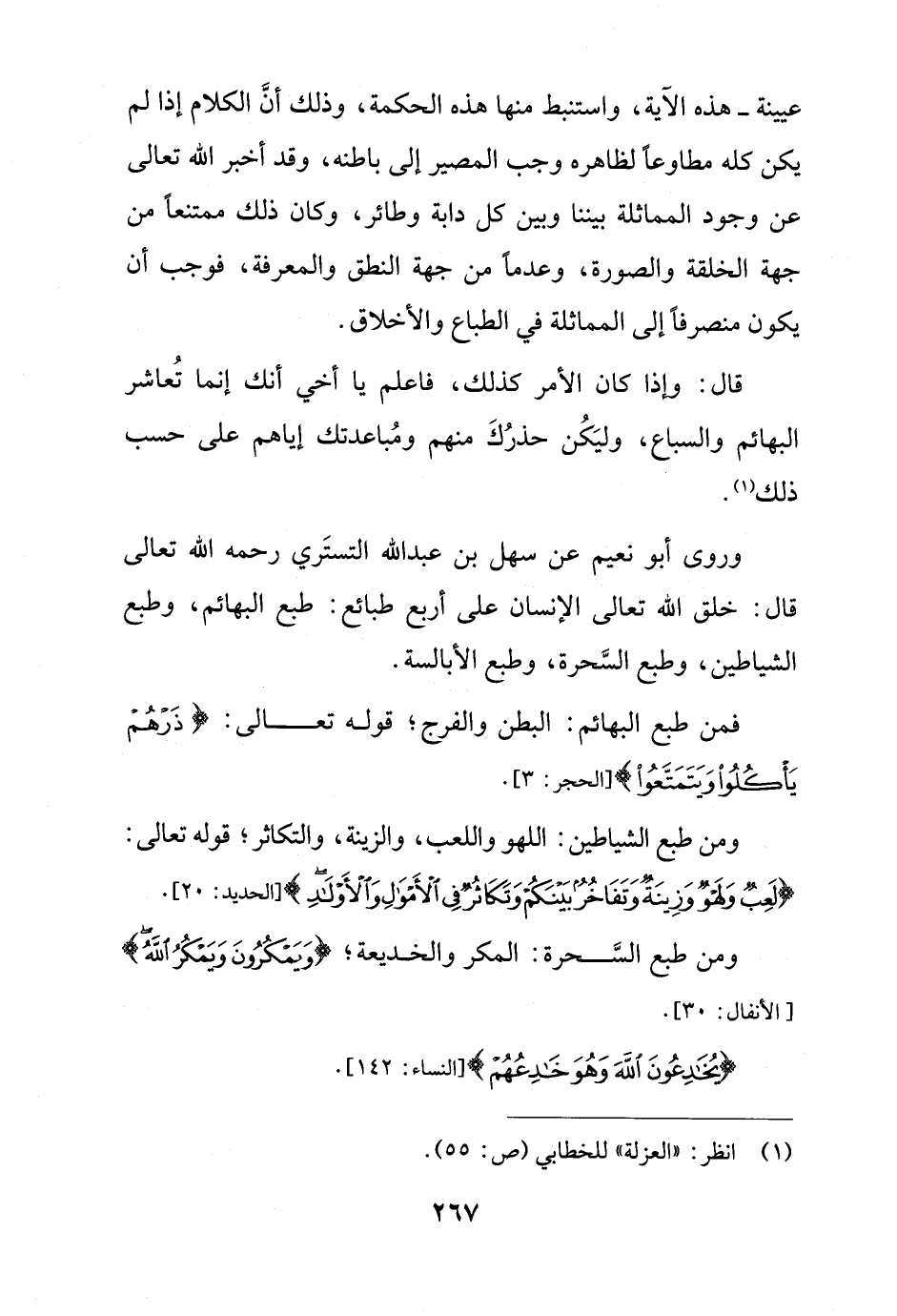 وروى أبو نعيم عن سهل بن عبد الله التستَري رحمه الله تعالى قال: خلق الله تعالى الإنسان على أربع طبائع: طبع البهائم، وطبع الشياطين، وطبع السَّحرة، وطبع الأبالسة.