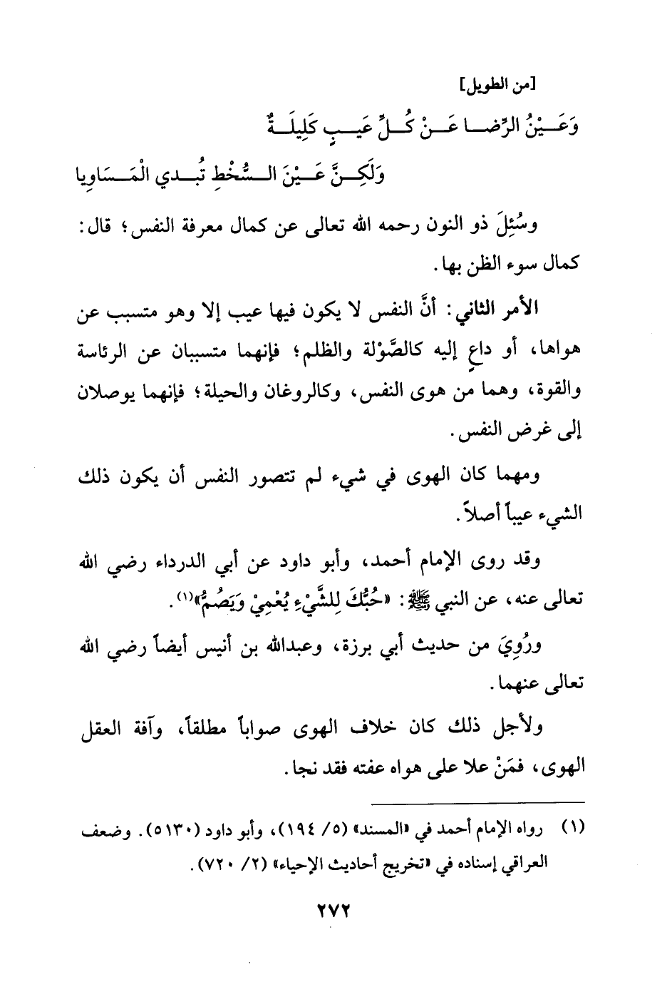 وقد روى الإمام أحمد، وأبو داود عن أبي الدرداء رضي الله تعالى عنه، عن النبي - صلى الله عليه وسلم -: "حُبُّكَ لِلشَّيءِ يُعْمِي وَيَصُمُّ" (¬1).