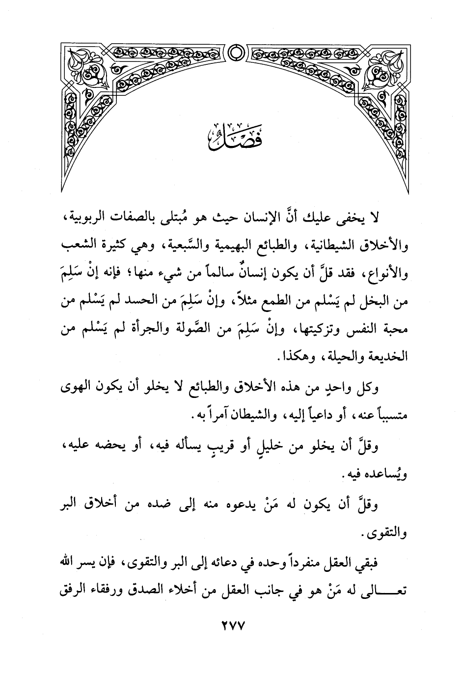 لا يخفى عليك أنَّ الإنسان حيث هو مُبتلى بالصفات الربوبية، والأخلاق الشيطانية، والطبائع البهيمية والسَّبعية، وهي كثيرة الشعب والأنواع، فقد قلَّ أن يكون إنسانٌ سالماً من شيء منها؛ فإنه إنْ سَلِمَ من البخل لم يَسْلم من الطمع مثلاً، وإنْ سَلِمَ من الحسد لم يَسْلم من محبة النفس وتزكيتها، وإنْ سَلِمَ من الصَّولة والجرأة لم يَسْلم من الخديعة والحيلة، وهكذا.