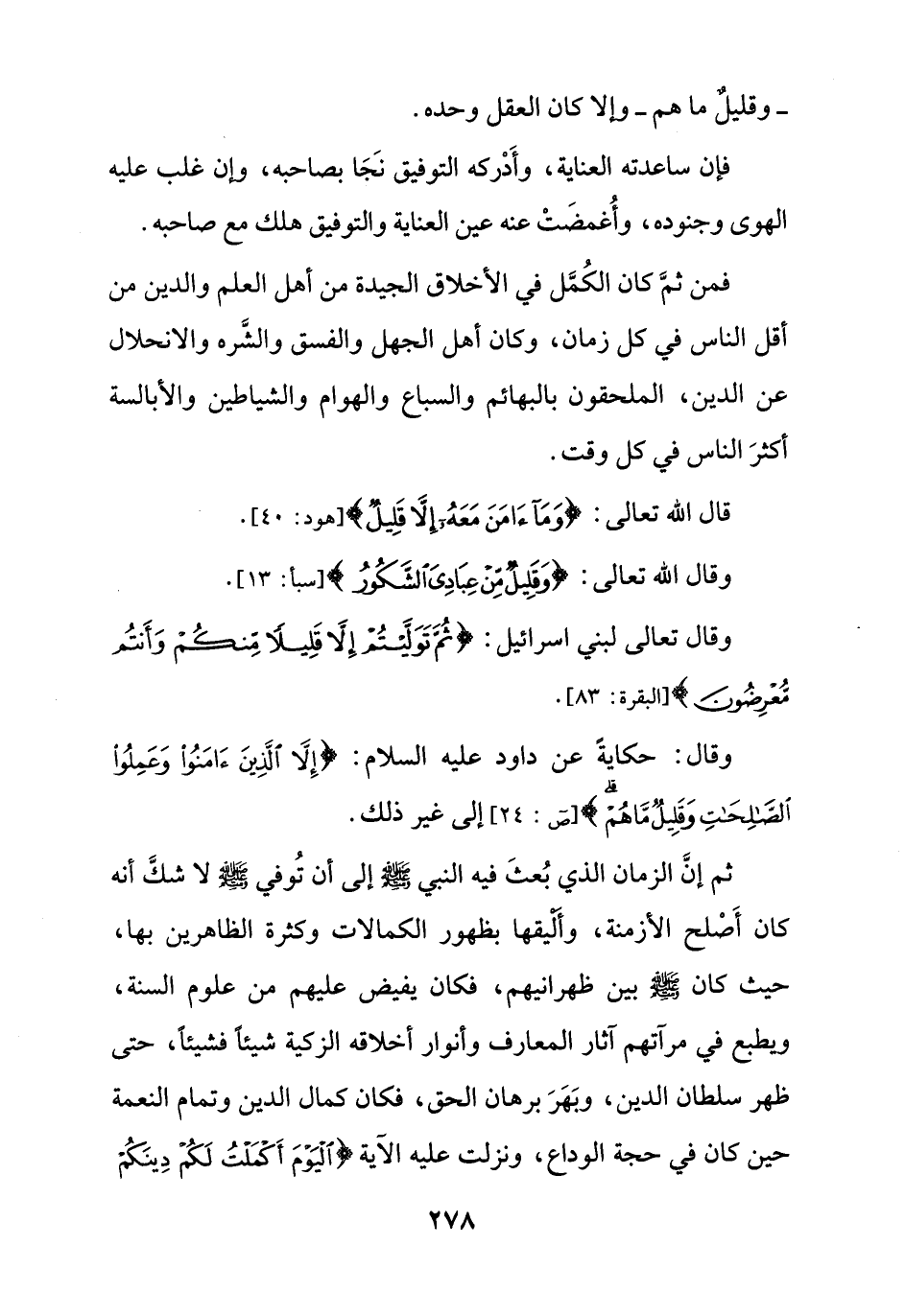 فمن ثمَّ كان الكُمَّل في الأخلاق الجيدة من أهل العلم والدين من أقل الناس في كل زمان، وكان أهل الجهل والفسق والشَّره والانحلال عن الدين، الملحقون بالبهائم والسباع والهوام والشياطين والأبالسة أكثرَ الناس في كل وقت.
