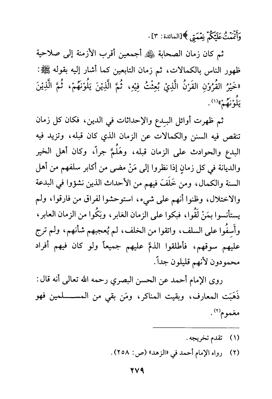 ثم ظهرت أوائل البِدع والإحداثات في الدين، فكان كل زمان تنقص فيه السنن والكمالات عن الزمان الذي كان قبله، وتزيد فيه البدع والحوادث على الزمان قبله، وهَلُمَّ جراً، وكان أهل الخير والديانة في كل زمانٍ إذا نظروا إلى مَنْ مضى من أكابر سلفهم من أهل السنة والكمال، ومن خَلَفَ فيهم من الأحداث الذين نشؤوا في البدعة والاختلال، وظنوا أنهم على شيء، استوحشوا لفراق من فارقوا، ولم يستأنسوا بمَنْ لَقُوا، فبكوا على الزمان الغابر، وبَكُوا من الزمان العابر، وأَسِفُوا على السلف، واتقوا من الخلف، لم يُعجبهم شأنهم، ولم ترج عليهم سوقهم، فأطلقوا الذمَّ عليهم جميعاً ولو كان فيهم أفراد محمودون لأنهم قليلون جداً.