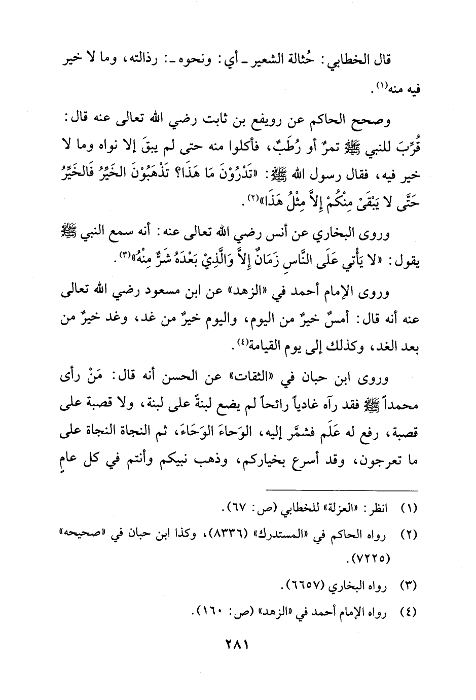 وصحح الحاكم عن رويفع بن ثابت رضي الله تعالى عنه قال: قُرِّبَ للنبي - صلى الله عليه وسلم - تمرٌ أو رُطَبٌ، فأكلوا منه حتى لم يبقَ إلا نواه وما لا خير فيه، فقال رسول الله - صلى الله عليه وسلم -: "تَدْرُوْنَ مَا هَذَا؟ تَذْهَبُوْنَ الخَيِّرُ فَالخَيِّرُ حَتَّى لا يَبْقَىْ مِنْكُمْ إِلاَّ مِثْلُ هَذَا" (¬2).