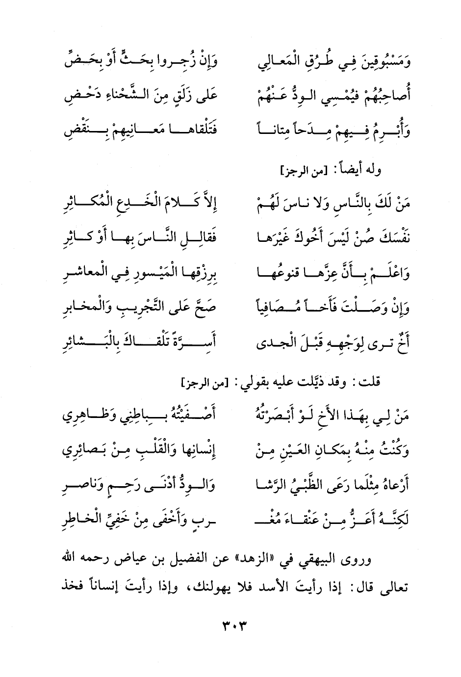 وروى البيهقي في "الزهد" عن الفضيل بن عياض رحمه الله تعالى قال: إذا رأيتَ الأسد فلا يهولنك، وإذا رأيتَ إنساناً فخذ