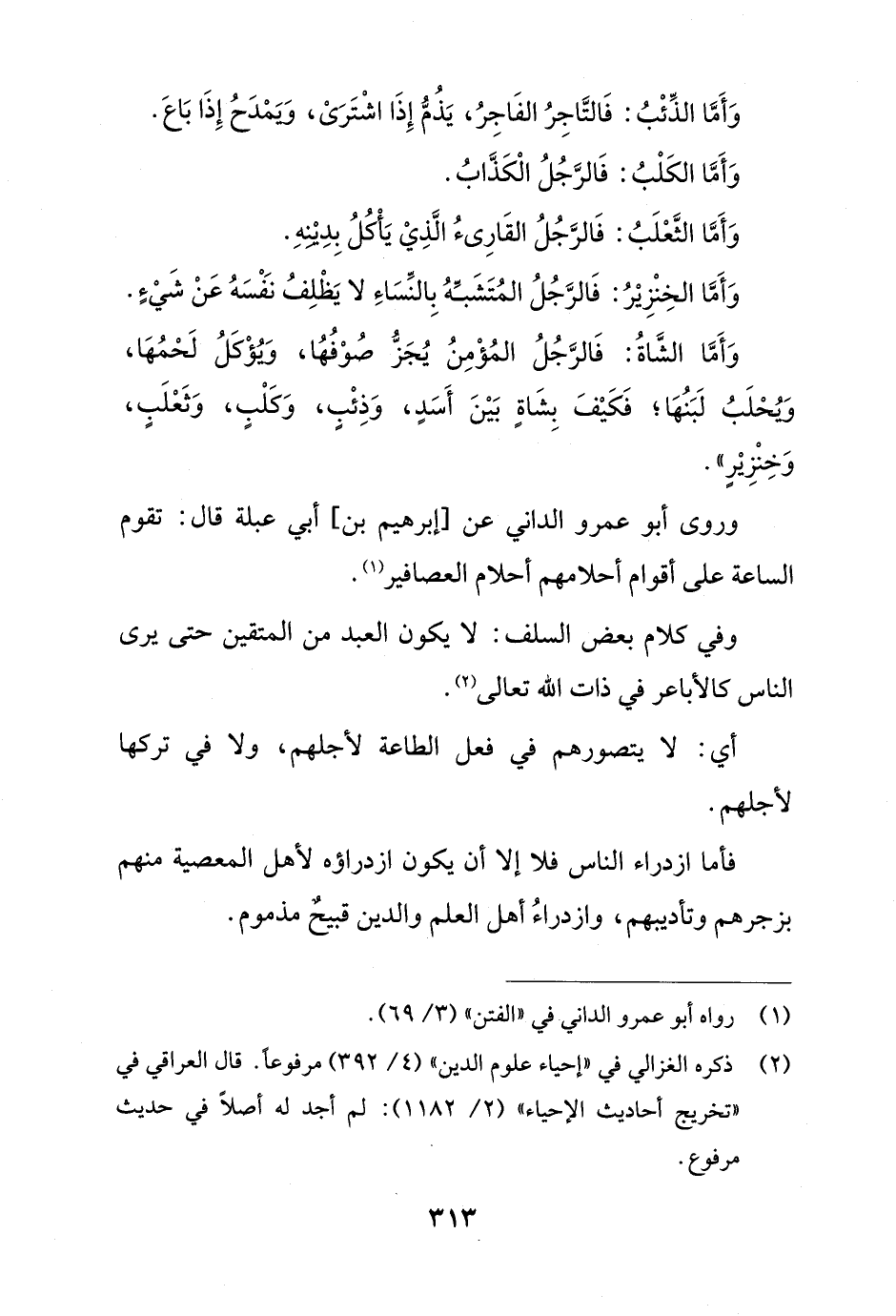 وَأَمَّا الشَّاةُ: فَالرَّجُلُ المُؤْمِنُ يُجَزُّ صُوْفُهُا، ويؤْكَلُ لَحْمُهَا، وَيُحْلَبُ لَبَنُهَا؛ فَكَيْفَ بِشَاةٍ بَيْنَ أَسَدٍ، وَذِئْبٍ، وَكَلْبٍ، وَثَعْلَبٍ، وَخِنْزِيْرٍ".