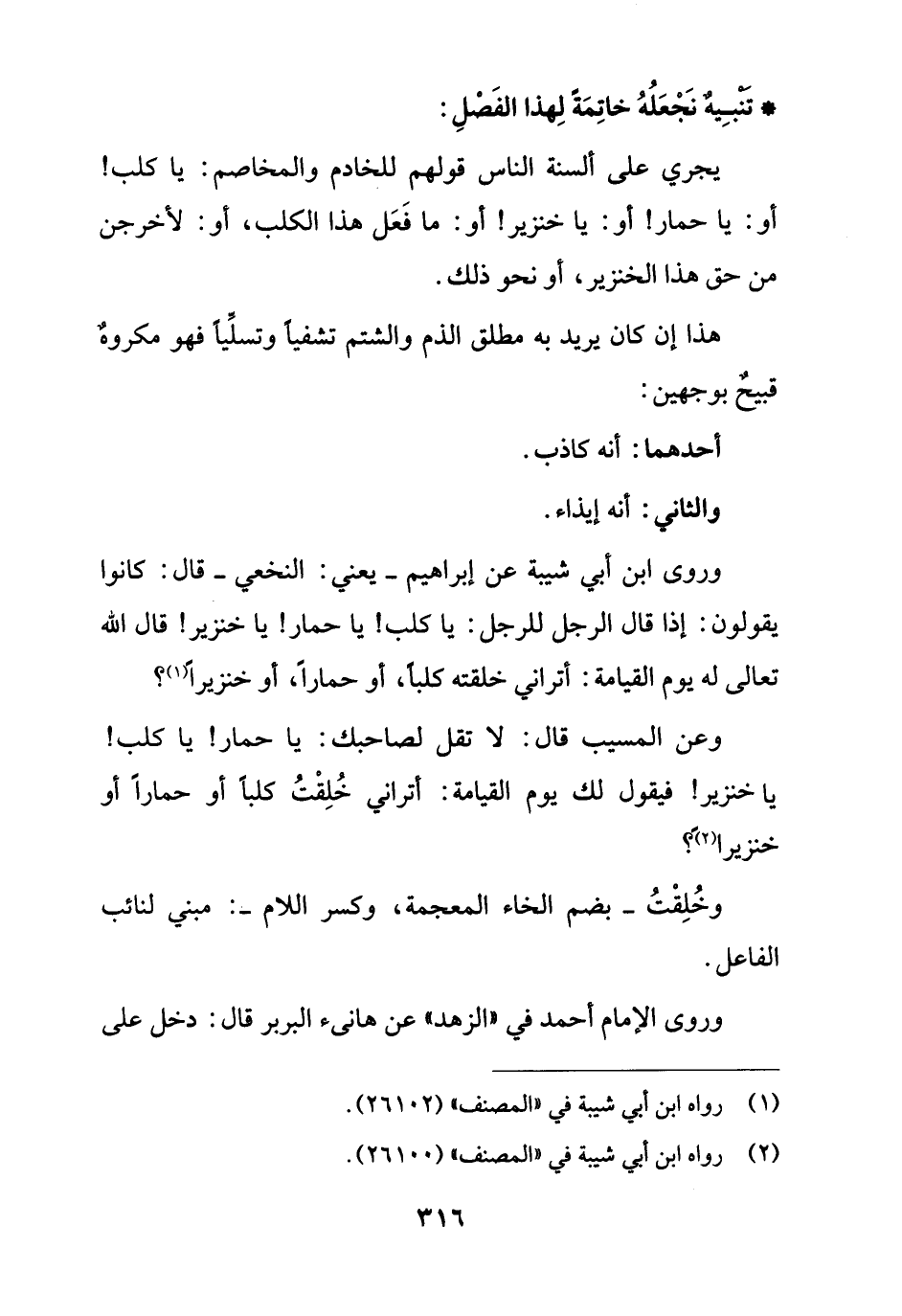 وعن المسيب قال: لا تقل لصاحبك: يا حمار! يا كلب! يا خنزير! فيقول لك يوم القيامة: أتراني خُلِقْتُ كلبًا أو حمارًا أو خنزيرًا (¬2)؟