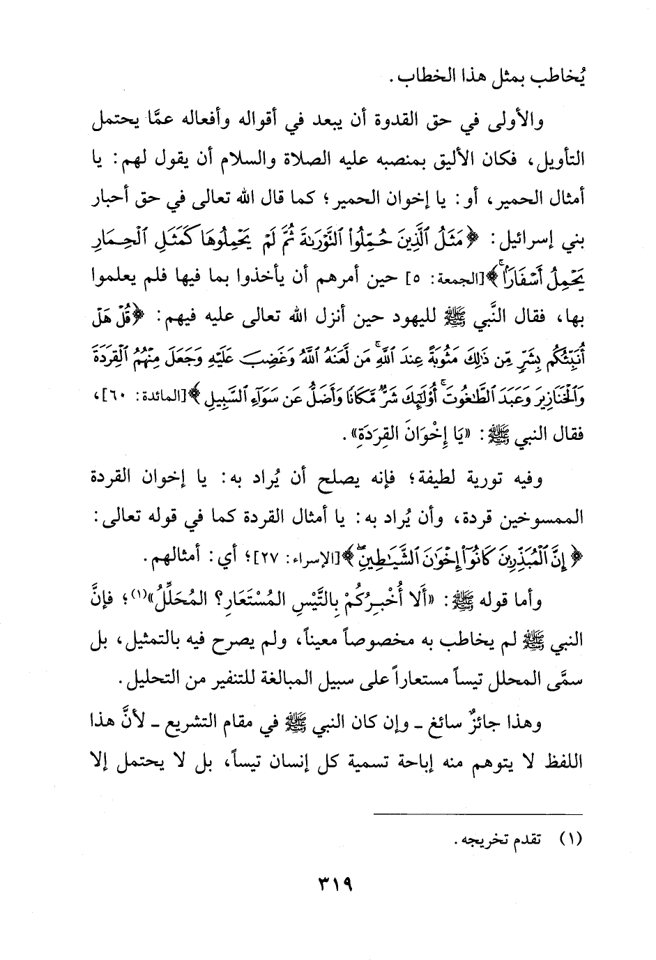 والأولى في حق القدوة أن يبعد في أقواله وأفعاله عمَّا يحتمل التأويل، فكان الأليق بمنصبه عليه الصلاة والسلام أن يقول لهم: يا أمثال الحمير، أو: يا إخوان الحمير؛ كما قال الله تعالى في حق أحبار بني إسرائيل: {مَثَلُ الَّذِينَ حُمِّلُوا التَّوْرَاةَ ثُمَّ لَمْ يَحْمِلُوهَا كَمَثَلِ الْحِمَارِ يَحْمِلُ أَسْفَارًا} [الجمعة: 5] حين أمرهم أن يأخذوا بما فيها فلم يعلموا بها، فقال النَّبي - صلى الله عليه وسلم - لليهود حين أنزل الله تعالى عليه فيهم: {قُلْ هَلْ أُنَبِّئُكُمْ بِشَرٍّ مِنْ ذَلِكَ مَثُوبَةً عِنْدَ اللَّهِ مَنْ لَعَنَهُ اللَّهُ وَغَضِبَ عَلَيْهِ وَجَعَلَ مِنْهُمُ الْقِرَدَةَ وَالْخَنَازِيرَ وَعَبَدَ الطَّاغُوتَ أُولَئِكَ شَرٌّ مَكَانًا وَأَضَلُّ عَنْ سَوَاءِ السَّبِيلِ} [المائدة: 60]، فقال النبي - صلى الله عليه وسلم -: "يَا إِخْوَانَ القِرَدَةِ".