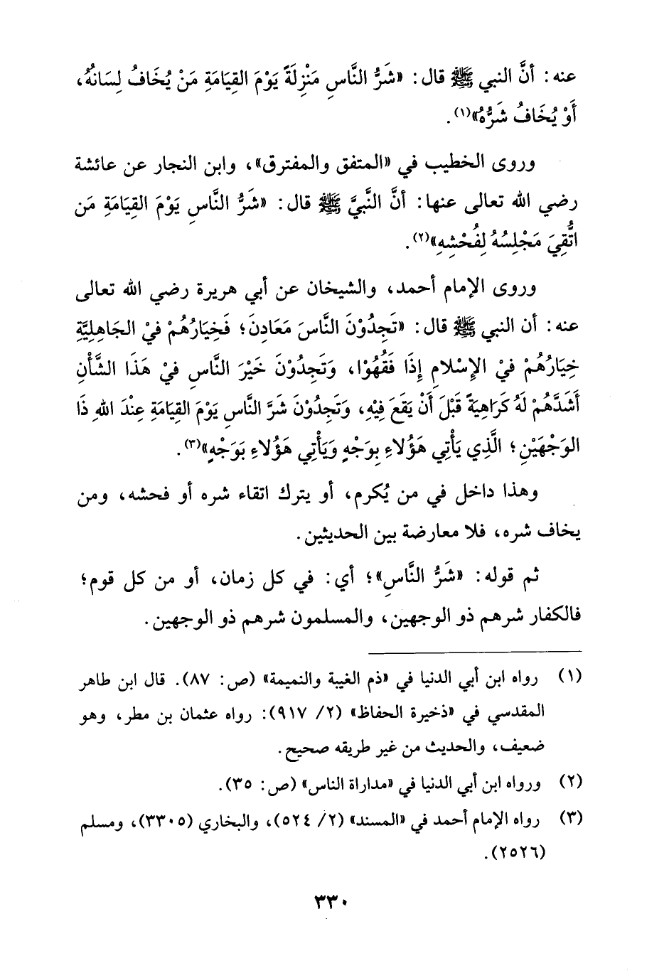 وروى الإمام أحمد، والشيخان عن أبي هريرة رضي الله تعالى عنه: أن النبي - صلى الله عليه وسلم - قال: "تَجِدُوْنَ النَّاسَ مَعَادِنَ؛ فَخِيَارُهُمْ فيْ الجَاهِلِيَّةِ خِيَارُهُمْ فيْ الإِسْلامِ إِذَا فَقُهُوْا، وَتَجِدُوْنَ خَيْرَ النَّاسِ فيْ هَذَا الشَّأْنِ أَشَدَّهُمْ لَهُ كَرَاهِيةً قَبْلَ أَنْ يَقَعَ فِيْهِ، وَتَجِدُوْنَ شَرَّ النَّاسِ يَوْمَ القِيامَةِ عِنْدَ اللهِ ذَا الوَجْهَيْنِ؛ الْذِي يَأْتِي هَؤُلاء بِوَجْهٍ وَيَأتِي هَؤُلاء بَوَجْهٍ" (¬3).