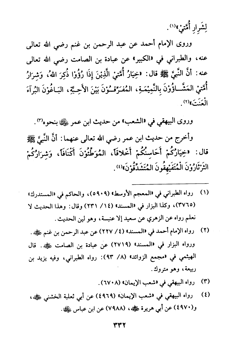 وروى الإمام أحمد عن عبد الرحمن بن غنم رضي الله تعالى عنه، والطبراني في "الكبير" عن عبادة بن الصامت رضي الله تعالى عنه: أنَّ النَّبيَّ - صلى الله عليه وسلم - قال: "خِيَارُ أُمَّتيْ الَّذِيْنَ إِذَا رُؤُوْا ذُكِرَ اللهُ، وَشِرَارُ أُمَّتيْ المَشَّاؤُوْنَ بِالنَّمِيْمَةِ، المُفَرِّقُوْنَ بَيْنَ الأَحِبَّةِ، البَاغُوْنَ البُراَءَ الْعَنَتَ" (¬2).