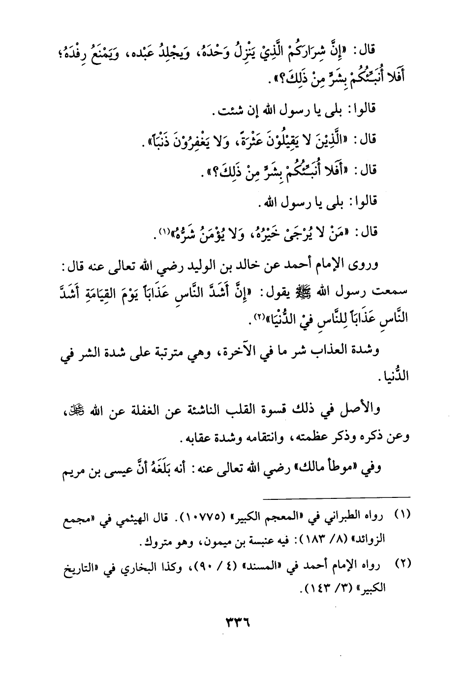 وروى الإمام أحمد عن خالد بن الوليد رضي الله تعالى عنه قال: سمعت رسول الله - صلى الله عليه وسلم - يقول: "إِنَّ أَشَدَّ النَّاسِ عَذَابًا يَوْمَ القِيَامَةِ أَشَدَّ النَّاسِ عَذَابًا لِلناسِ فيْ الدُّنْيَا" (¬2).