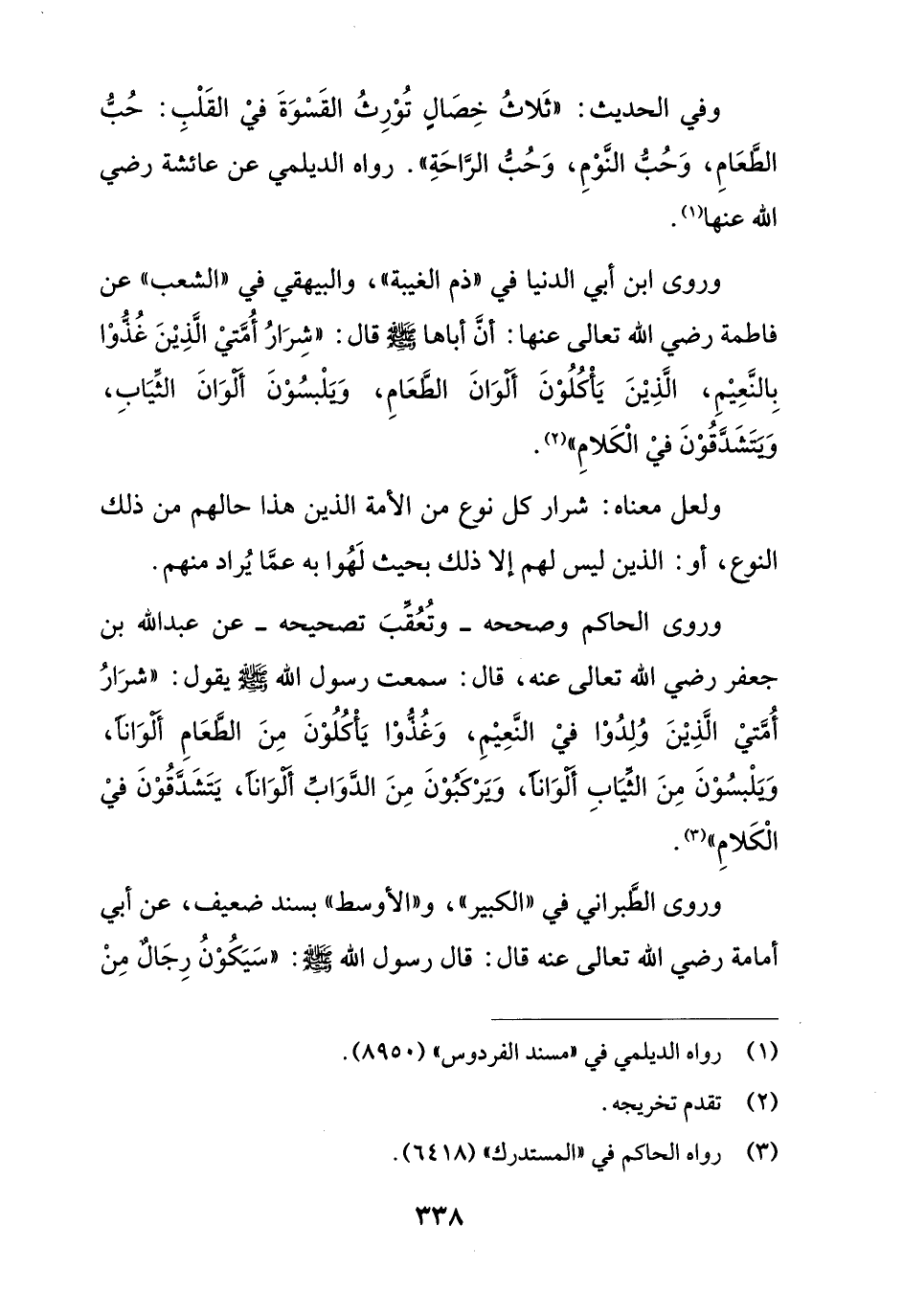 وروى الحاكم وصححه -وتُعُقِّبَ تصحيحه- عن عبد الله بن جعفر رضي الله تعالى عنه، قال: سمعت رسول الله -صلى الله عليه وسلم - يقول: "شرَارُ أُمَّتيْ الَّذِيْنَ ولِدُوْا فيْ النَّعِيْمِ، وَغُذُّوْا يَأْكُلُوْنَ مِنَ الطَّعَامِ ألْوَانًا، وَيَلْبسُوْنَ مِنَ الثِّيَابِ ألوَانًا، وَيَرْكَبُوْنَ مِنَ الدَّوَابِّ ألوَانًا، يَتَشَدَّقُوْنَ فيْ الْكَلامِ" (¬3).