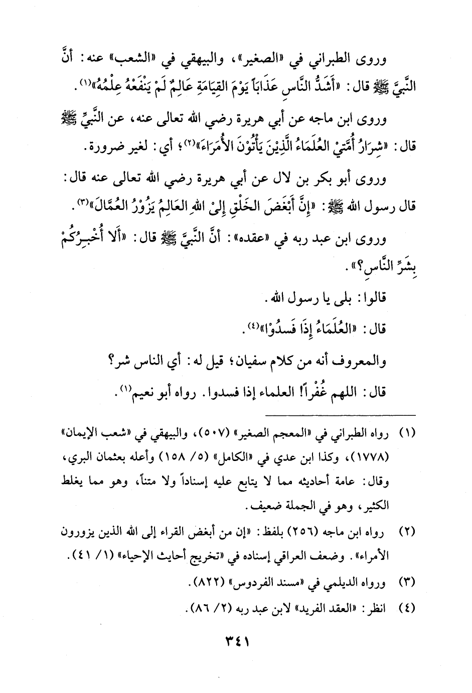 وروى أبو بكر بن لال عن أبي هريرة رضي الله تعالى عنه قال: قال رسول الله - صلى الله عليه وسلم -: "إِنَّ أَبْغَضَ الخَلْقِ إِلىْ اللهِ العَالِمُ يَزُوْرُ العُمَّالَ" (¬3).