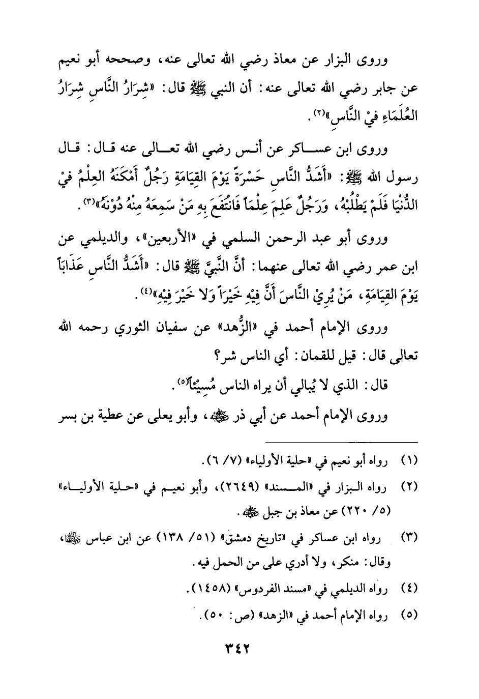 وروى البزار عن معاذ رضي الله تعالى عنه، وصححه أبو نعيم عن جابر رضي الله تعالى عنه: أن النبي - صلى الله عليه وسلم - قال: "شِرَارُ النَّاسِ شِرَارُ العُلَمَاءِ فيْ النَّاسِ" (¬2).