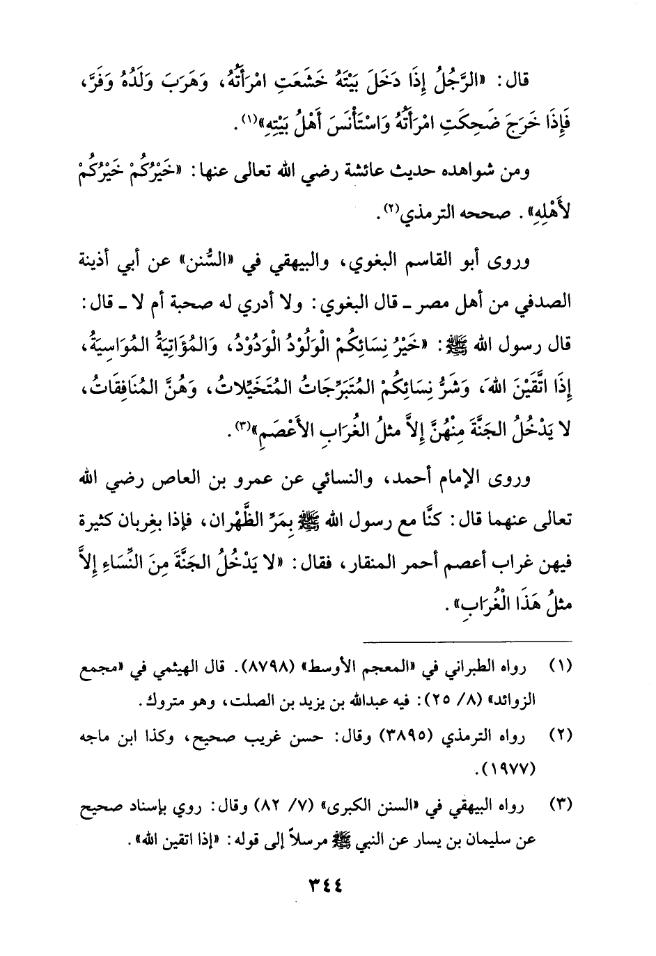 وروى أبو القاسم البغوي، والبيهقي في "السُّنن" عن أبي أذينة الصدفي من أهل مصر -قال البغوي: ولا أدري له صحبة أم لا - قال: قال رسول الله - صلى الله عليه وسلم -: "خَيْرُ نِسَائِكُمْ الْوَلُوْدُ الْوَدُوْدُ، وَالمُؤَاتِيَةُ المُوَاسِيَةُ، إِذَا اتَّقَيْنَ اللهَ، وَشَرُّ نِسَائِكُمْ المُتَبَرِّجَاتُ المُتَخَيِّلاتُ، وَهُنَّ المُنَافِقَاتُ، لا يَدْخُلُ الجَنَّةَ مِنْهُنَّ إِلَّا مثلُ الغُرَابِ الأَعْصَمِ" (¬3).
