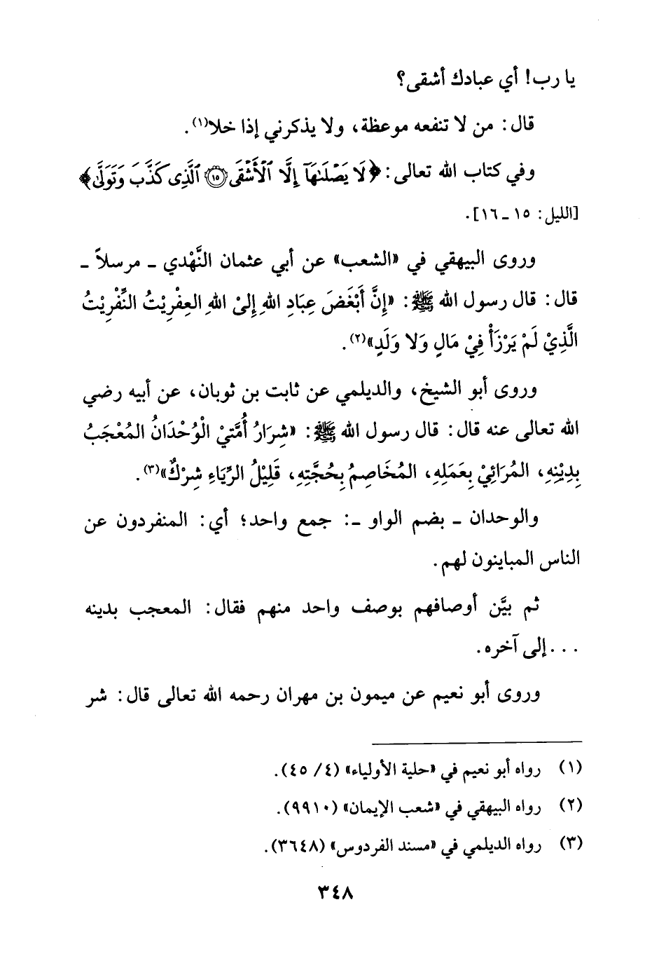 وروى أبو الشيخ، والديلمي عن ثابت بن ثوبان، عن أبيه رضي الله تعالى عنه قال: قال رسول الله - صلى الله عليه وسلم -: "شِرَارُ أُمَّتيْ الْوحْدَانُ المُعْجَبُ بِدِيْنِهِ، المُرَائِيْ بِعَمَلِهِ، المُخَاصِمُ بِحُجَّتِهِ، قَلِيْلُ الرِّيَاءِ شِرْكٌ" (¬3).