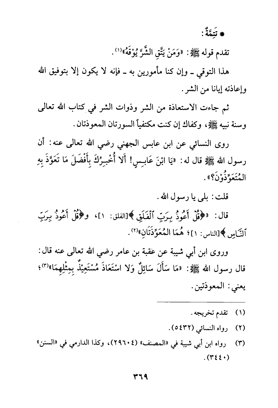 وروى ابن أبي شيبة عن عقبة بن عامر رضي الله تعالى عنه قال: قال رسول الله -صلى الله عليه وسلم-: "مَا سَأَلَ سَائِلٌ وَلا اسْتَعَاذَ مُسْتَعِيْذٌ بِمِثْلِهِمَا" (¬3)؛ يعني: المعوذتين.