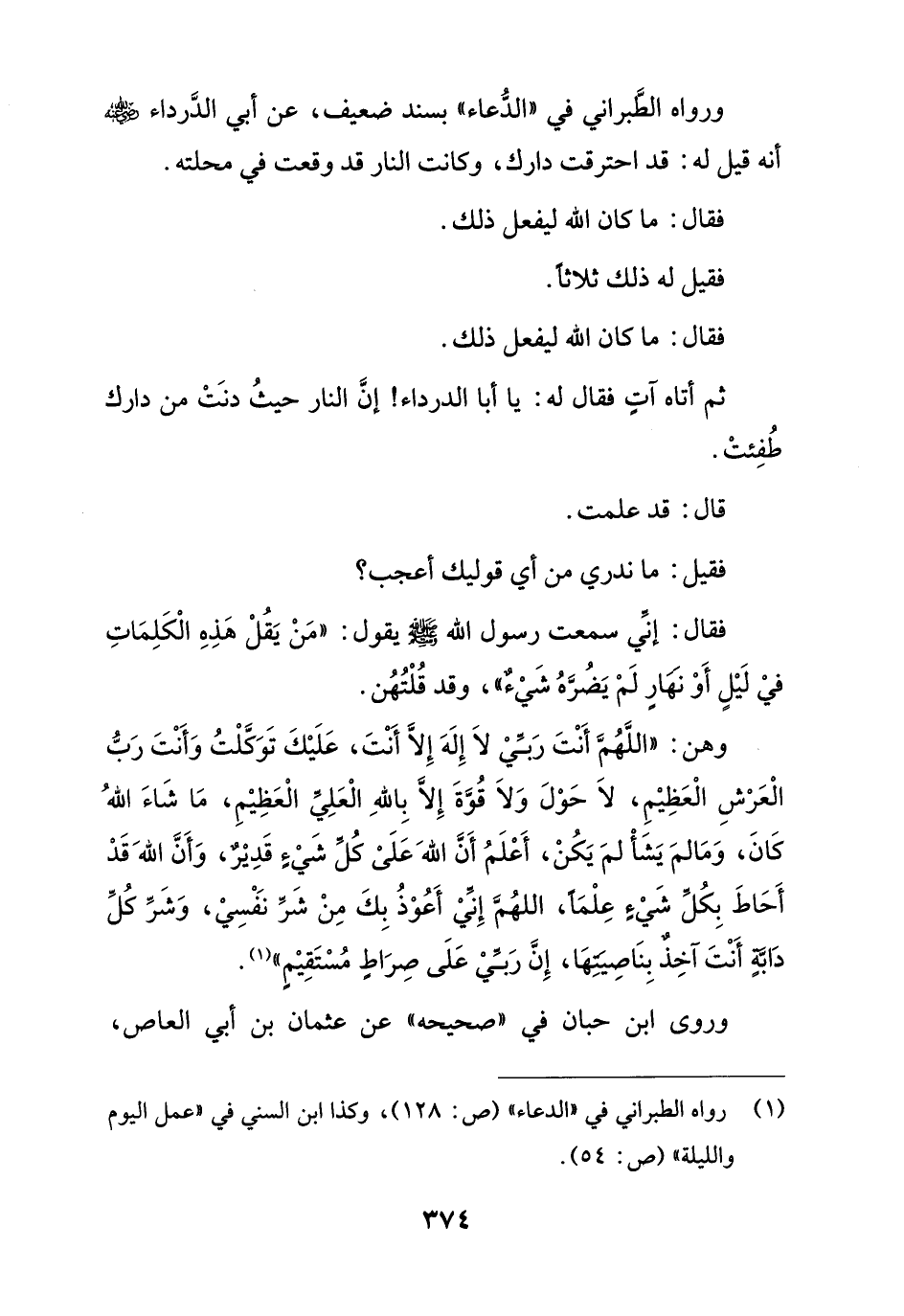 ورواه الطَّبراني في "الدُّعاء" بسند ضعيف، عن أبي الدَّرداء -رضي الله عنه - أنه قيل له: قد احترقت دارك، وكانت النار قد وقعت في محلته.