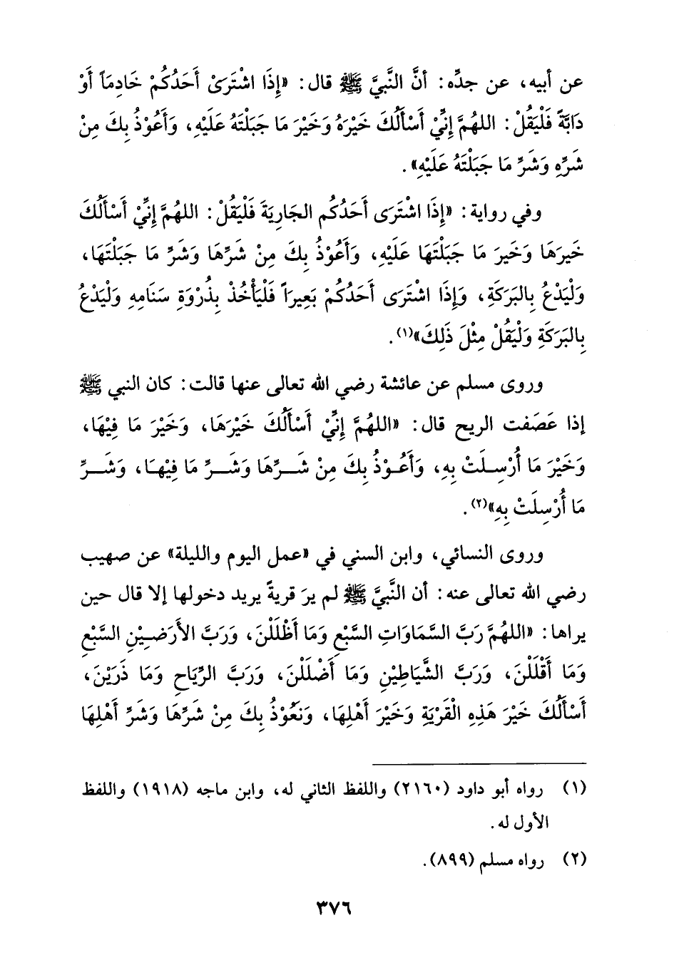 وفي رواية: "إِذَا اشْتَرَى أَحَدُكُم الجَارِيَةَ فَلْيَقُلْ: اللهُمَّ إِنِّىْ أَسْأَلُكَ خَيرَهَا وَخَيرَ مَا جَبَلْتَهَا عَلَيْهِ، وَأَعُوْذُ بِكَ مِنْ شَرِّهَا وَشَرِّ مَا جَبَلْتَهَا، وَلْيَدْعُ بِالبَرَكَةِ، وَإِذَا اشْتَرَى أَحَدُكُمْ بَعِيرًا فَلْيَأْخُذْ بِذُرْوَةِ سَنَامِهِ وَلْيَدْعُ بِالبَرَكَةِ وَلْيَقُلْ مِثْلَ ذَلِكَ" (¬1).
