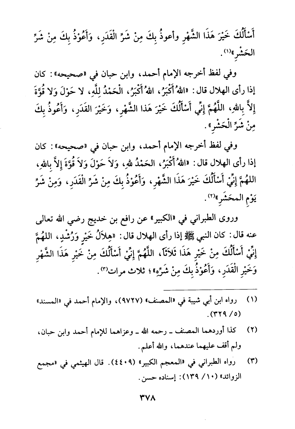 وفي لفظ أخرجه الإمام أحمد، وابن حبان في "صحيحه": كان إذا رأى الهلال قال: "اللهُ أَكْبَرُ، اللهُ أَكْبَرُ، الْحَمْدُ لِلَّهِ، لا حَوْلَ وَلا قُوَّةَ إِلاَّ بِاللهِ، اللَّهُمَّ إِنَّي أَسْأَلُكَ خَيْرَ هَذا الشَّهْرِ، وَخَيْرَ القَدَرِ، وَأَعُوذُ بِكَ مِنْ شَرِّ الْحَشْرِ".