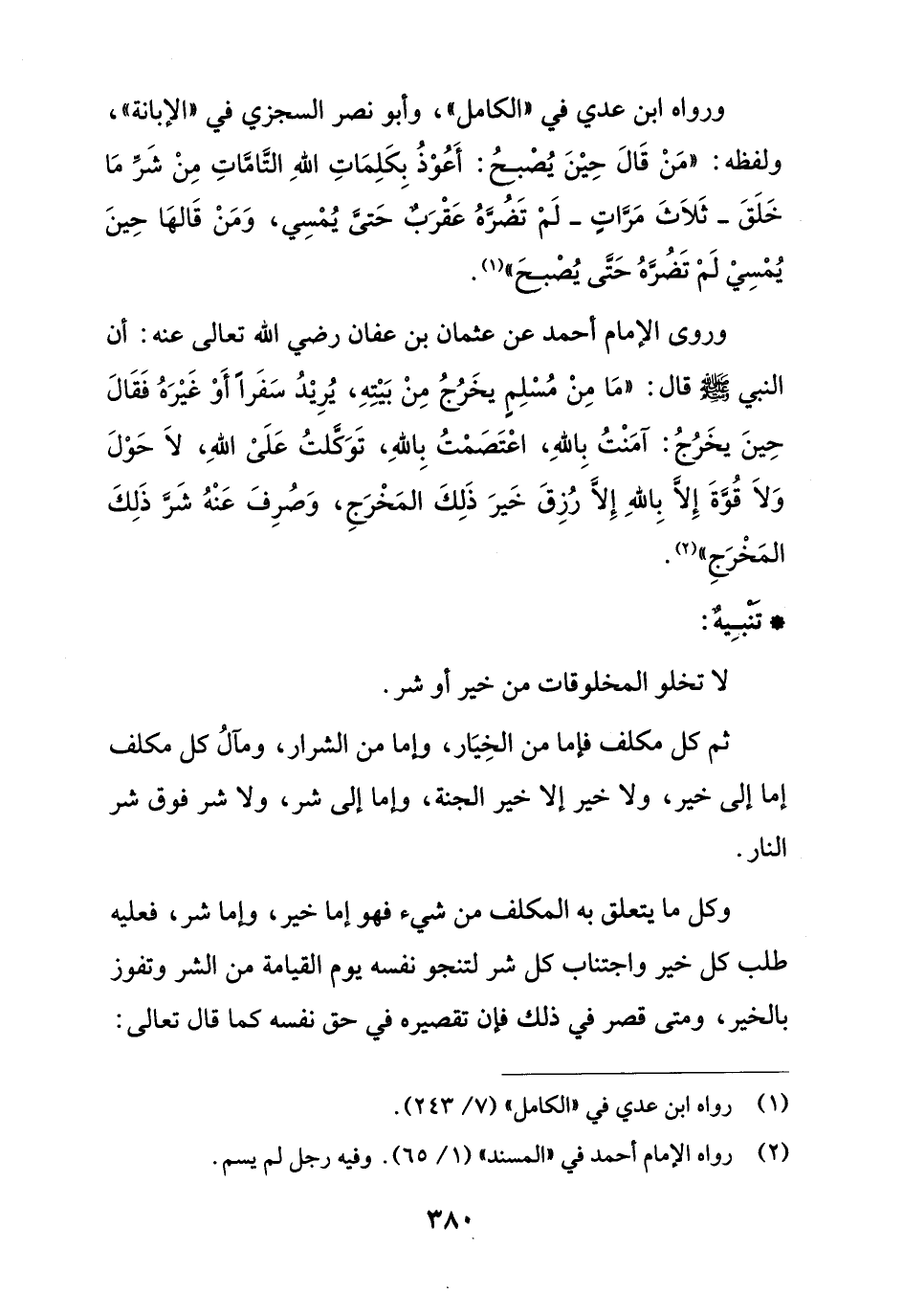 ورواه ابن عدي في "الكامل"، وأبو نصر السجزي في "الإبانة"، ولفظه: "مَنْ قَالَ حِيْنَ يُصْبحُ: أَعُوْذُ بِكَلِمَاتِ اللهِ التَّامَّاتِ مِنْ شَرِّ مَا خَلَقَ - ثَلاَثَ مَرَّاتِ - لَمْ تَضُرَّهُ عَقْرَبٌ حَتَّى يُمْسِي، وَمَنْ قَالهَا حِينَ يُمْسِيْ لَمْ تَضُرَّهُ حَئى يُصْبحَ" (¬1).