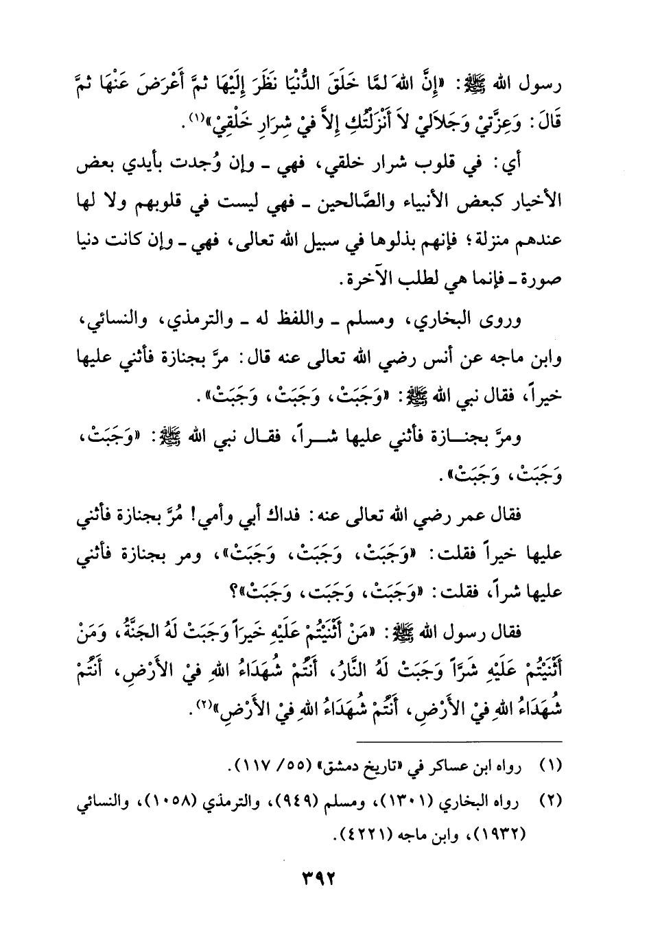 وروى البخاري، ومسلم - واللفظ له - والترمذي، والنسائي، وابن ماجه عن أنس رضي الله تعالى عنه قال: مرَّ بجنازة فأثني عليها خيراً، فقال نبي الله -صلى الله عليه وسلم-: "وَجَبَتْ، وَجَبَتْ، وَجَبَتْ".