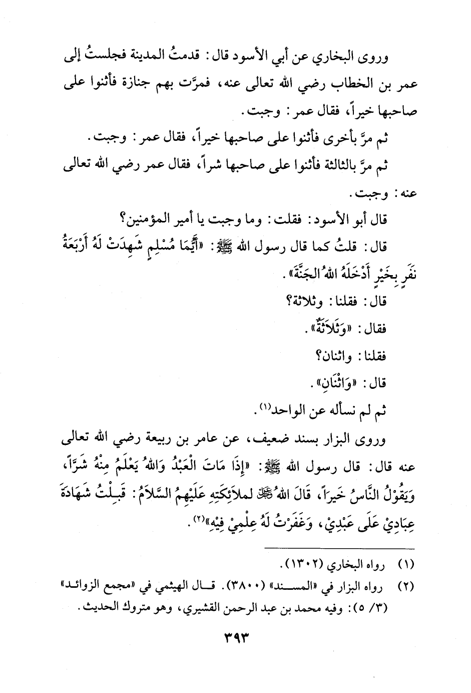 وروى البخاري عن أبي الأسود قال: قدمتُ المدينة فجلستُ إلى عمر بن الخطاب رضي الله تعالى عنه، فمرَّت بهم جنازة فأثنوا على صاحبها خيراً، فقال عمر: وجبت.