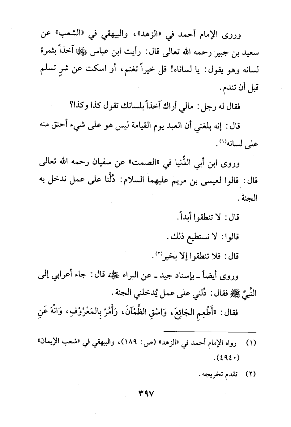 وروى الإمام أحمد في "الزهد"، والبيهقي في "الشعب" عن سعيد بن جبير رحمه الله تعالى قال: رأيت ابن عباس -رضي الله عنه- آخذاً بثمرة لسانه وهو يقول: يا لساناه! قل خيراً تغنم، أو اسكت عن شرٍ تسلم قبل أن تندم.