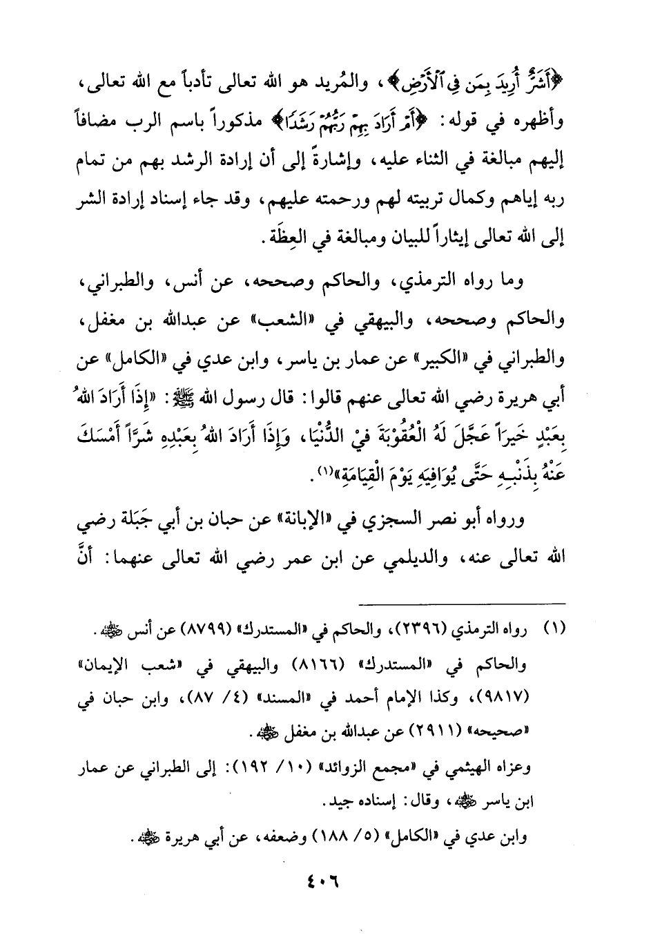 وما رواه الترمذي، والحاكم وصححه، عن أنس، والطبراني، والحاكم وصححه، والبيهقي في "الشعب" عن عبد الله بن مغفل، والطبراني في "الكبير" عن عمار بن ياسر، وابن عدي في "الكامل" عن أبي هريرة رضي الله تعالى عنهم قالوا: قال رسول الله -صلى الله عليه وسلم-: "إِذَا أَرَادَ اللهُ بِعَبْدٍ خَيرًا عَجَّلَ لَهُ الْعُقُوْبَةَ فيْ الدُّنْيَا، وإِذَا أَرَادَ اللهُ بِعَبْدِهِ شَرًّا أَمْسَكَ عَنْهُ بِذَنْبِهِ حَتَّى يُوَافِيَهِ يَوْمَ الْقِيَامَةِ" (¬1).