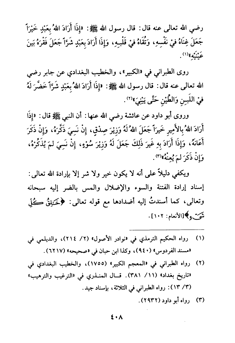 ويكفي دليلاً على أنه لا يكون خير ولا شر إلا بإرادة الله تعالى: إسناد إرادة الفتنة والسوء والإضلال والمس بالضر إليه سبحانه وتعالى، كما أسندتُ إليه أضدادها مع قوله تعالى: {خَالِقُ كُلِّ شَيْءٍ} [الأنعام: 102].