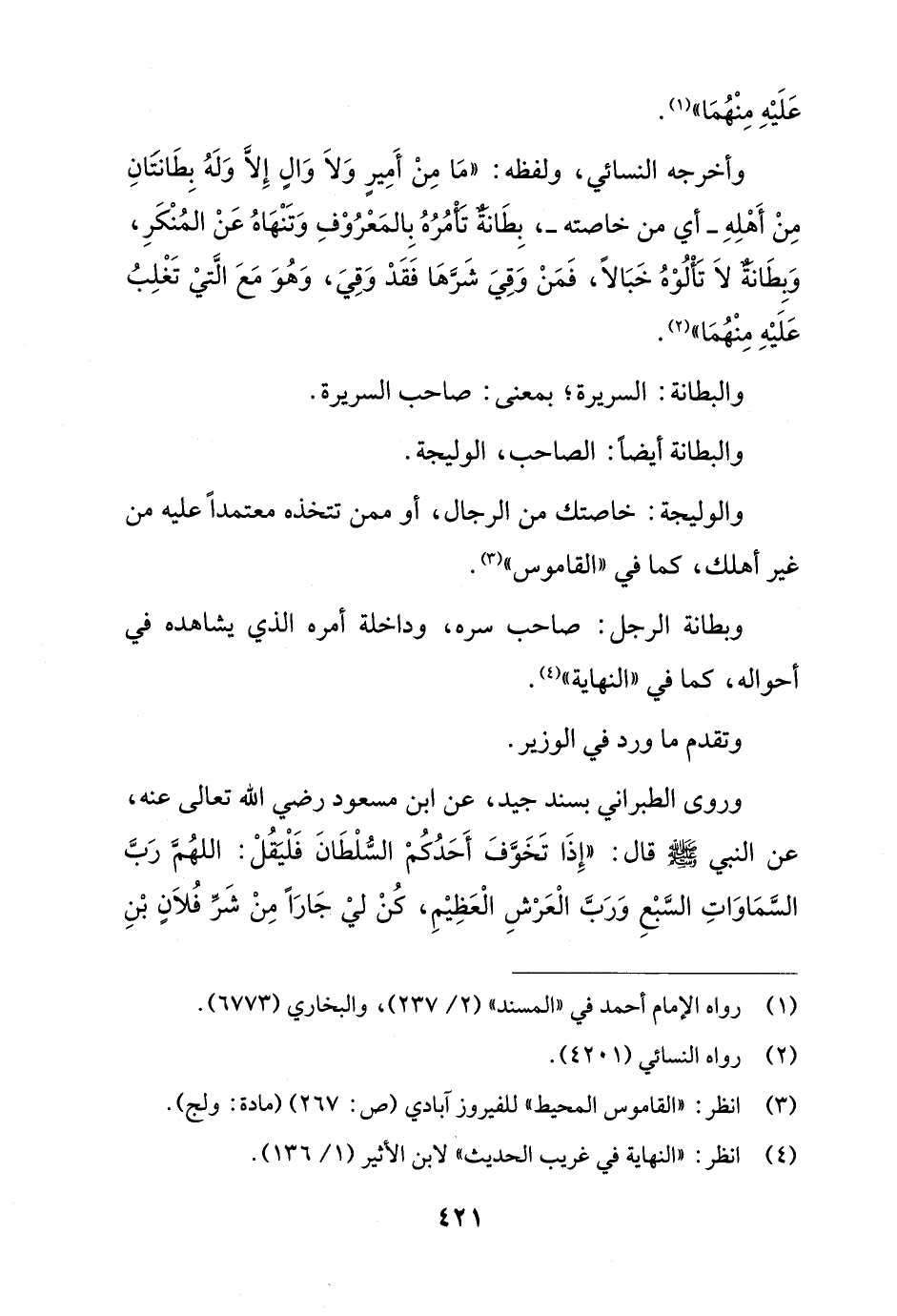 وأخرجه النسائي، ولفظه: "مَا مِنْ أَمِيرٍ وَلاَ وَالٍ إِلاَّ وَلَهُ بِطَانتَانِ مِنْ أَهْلِهِ - أي من خاصته -، بِطَانَةٌ تَأْمُرُهُ بِالمَعْرُوْفِ وَتَنْهَاهُ عَنْ المُنْكَرِ، وَبِطَانَةٌ لاَ تَأْلُوْهُ خَبَالاً، فَمَنْ وَقِيَ شَرَّهَا فَقَدْ وَقِيَ، وَهُوَ مَعَ الَّتيْ تَغْلِبُ عَلَيْهِ مِنْهُمَا" (¬2).